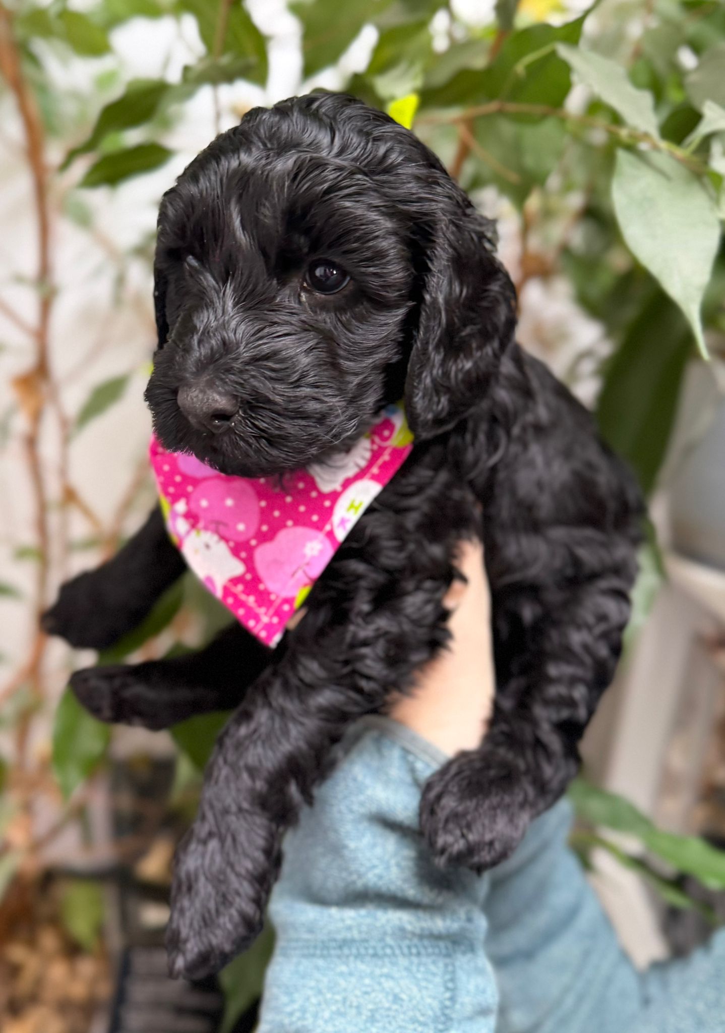 Miss Blue, also known as Lucky, is an absolutely beautiful little puppy, with a shiny black wavy fleece coat and the sweetest white spot on her chest. She has such a gentle and tender nature that you instantly feel calm and happy just being around her.
