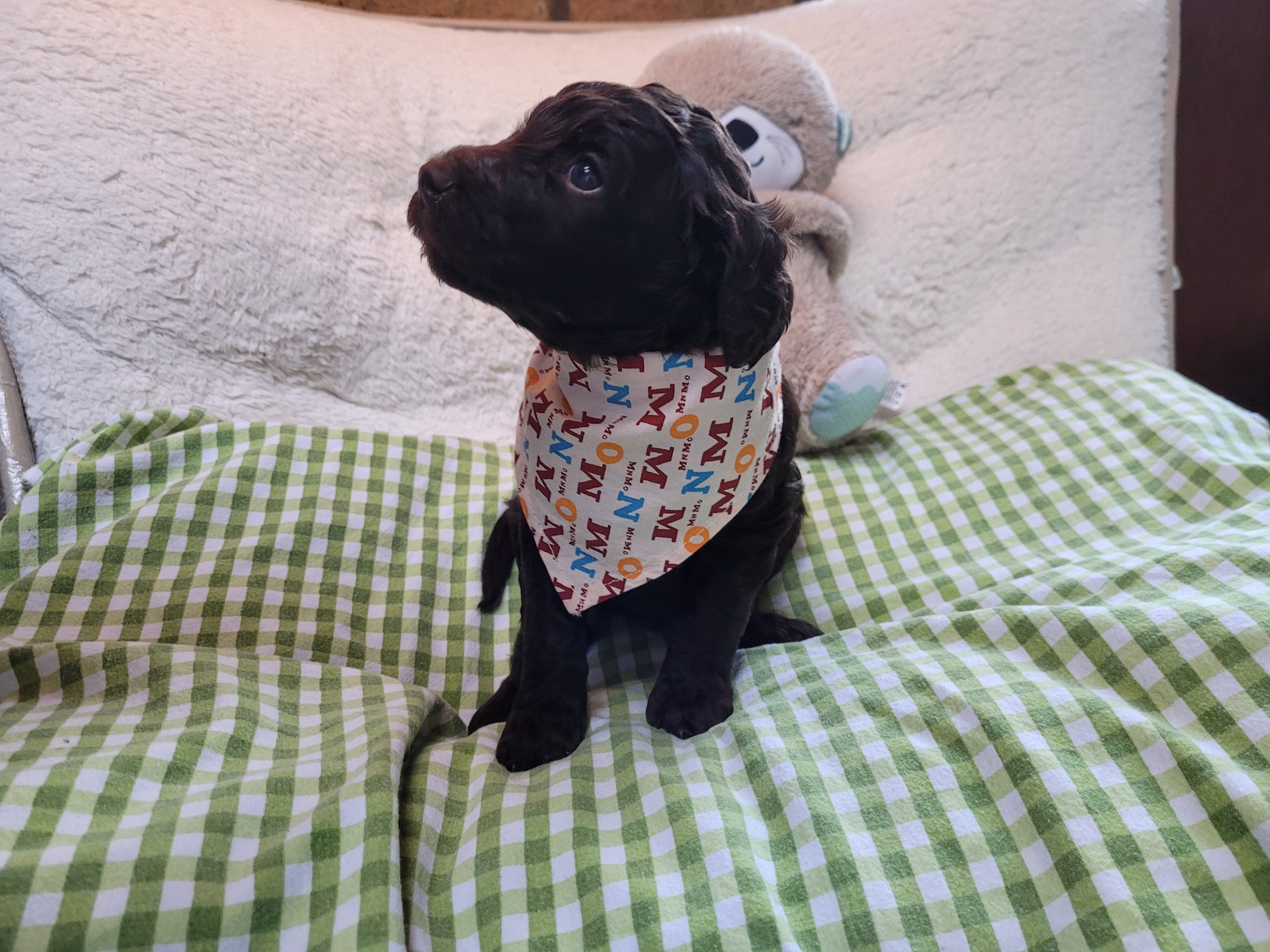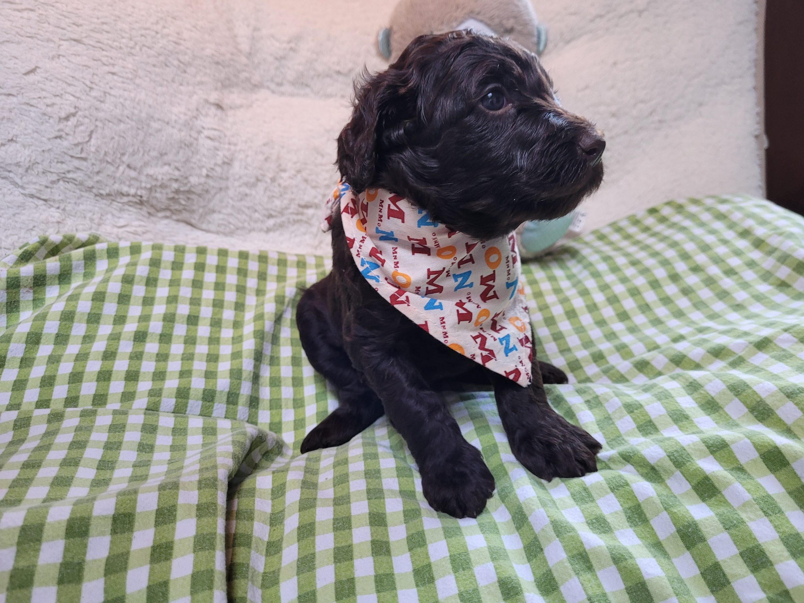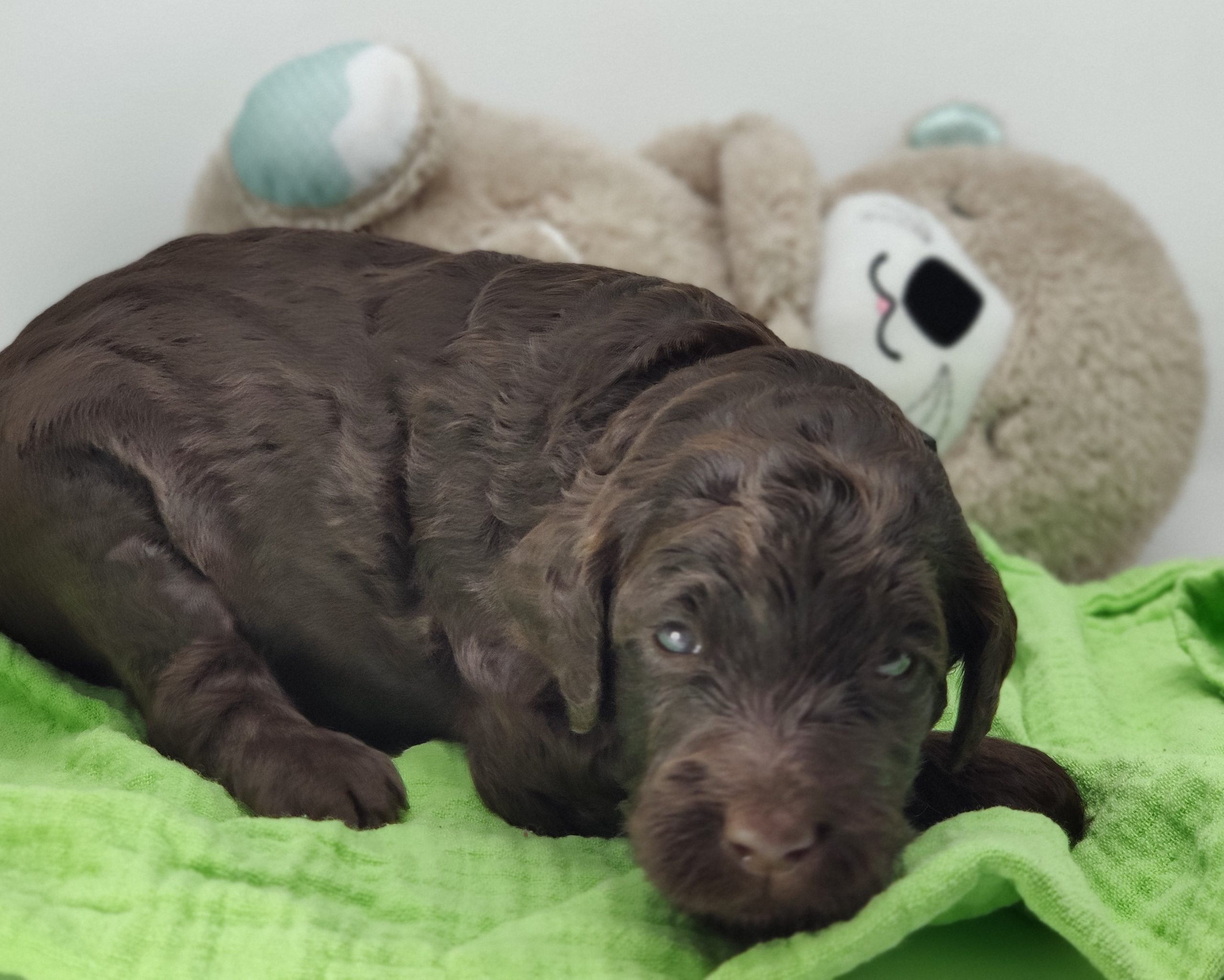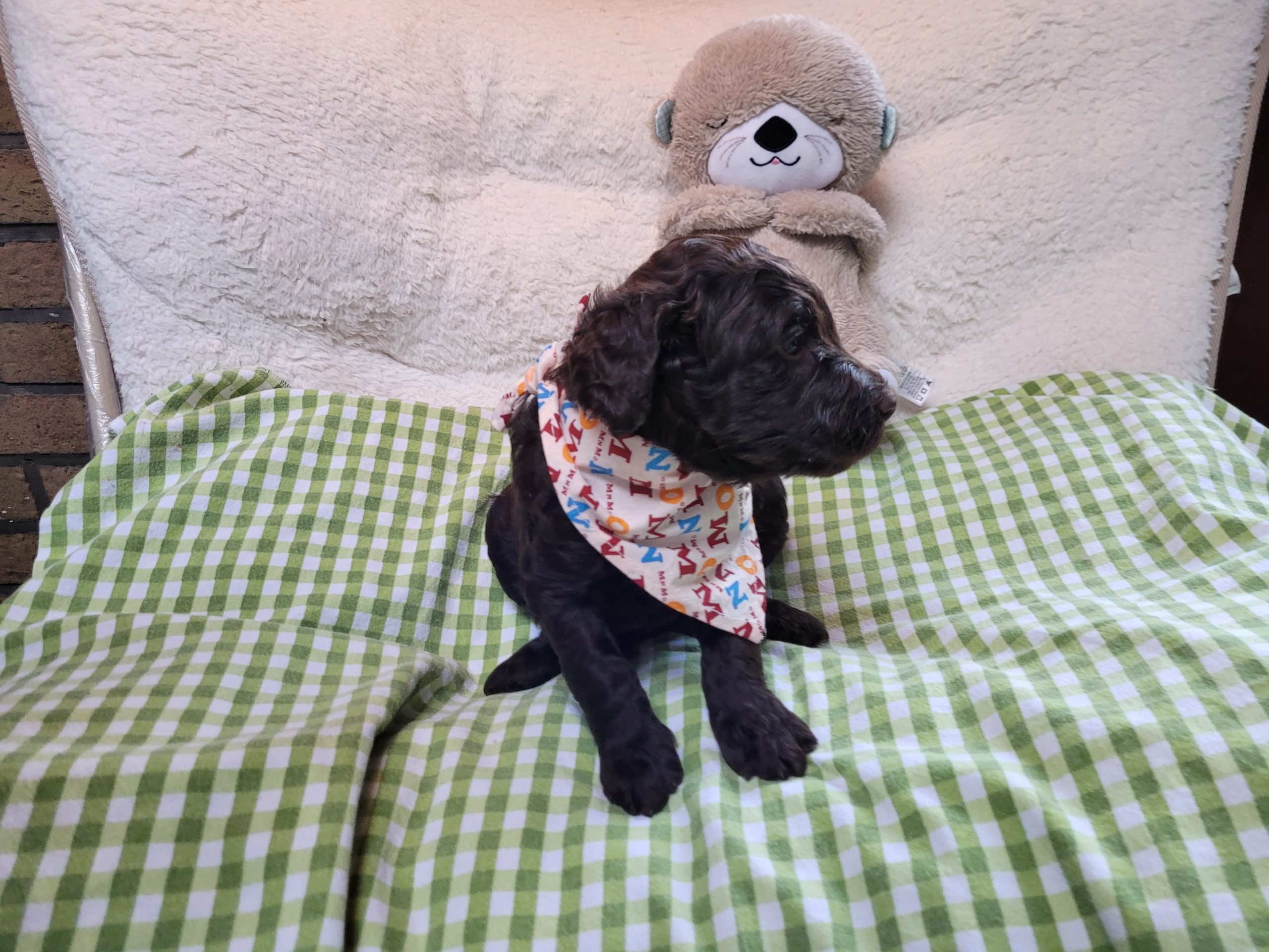 Ms Orange, a gorgeous dark brown puppy with an amazing wavy fleece coat, is a harmonious blend of playful energy and relaxed vibes. Her presence is a constant source of joy, brightening the days of those around her with her cheerful demeanour. Not only is she fun and easygoing, but Ms Orange is also remarkably intelligent; she picks up new commands and tricks with swift ease. Her quick learning ability, coupled with her joyful and laid-back nature, makes her a wonderful and engaging companion.