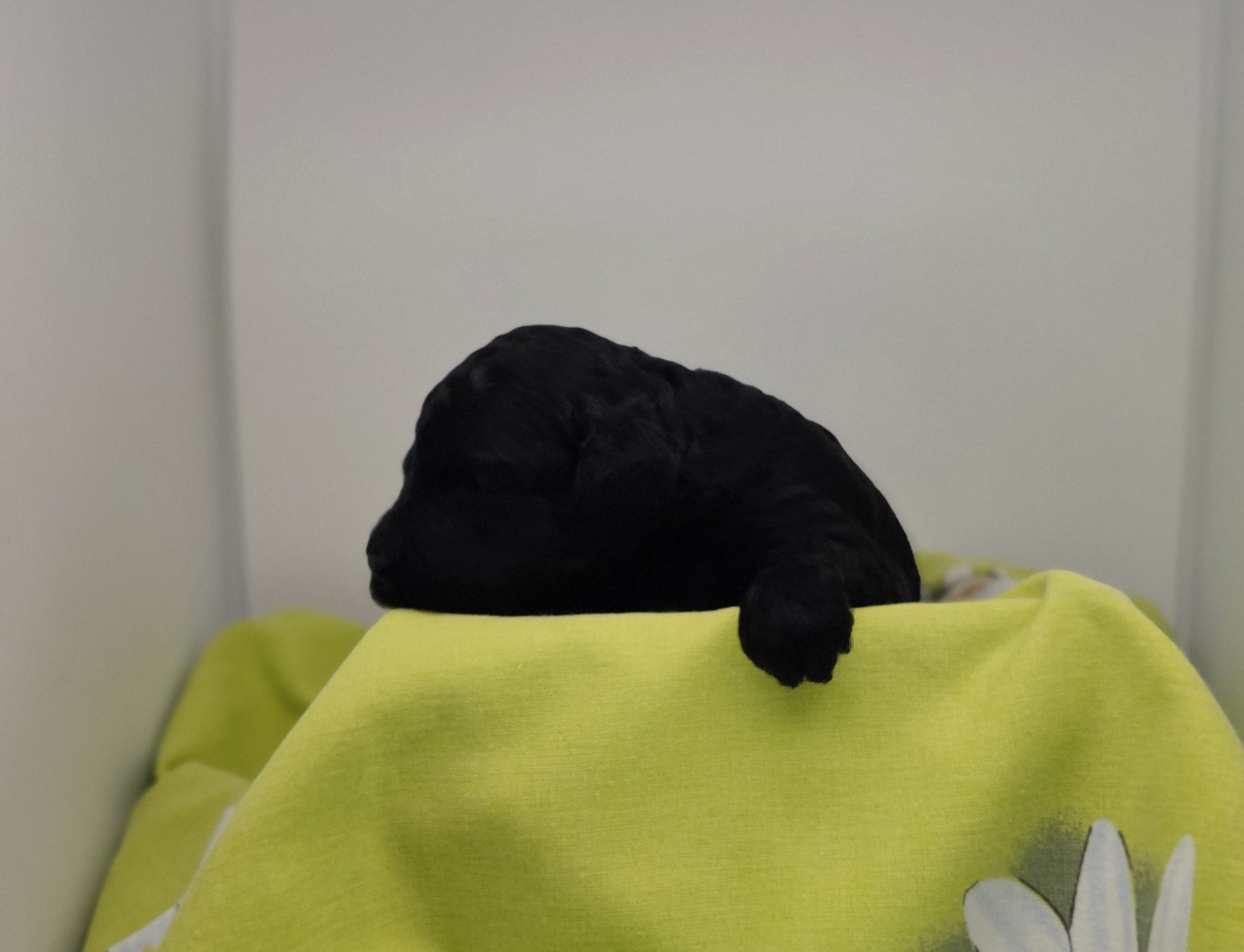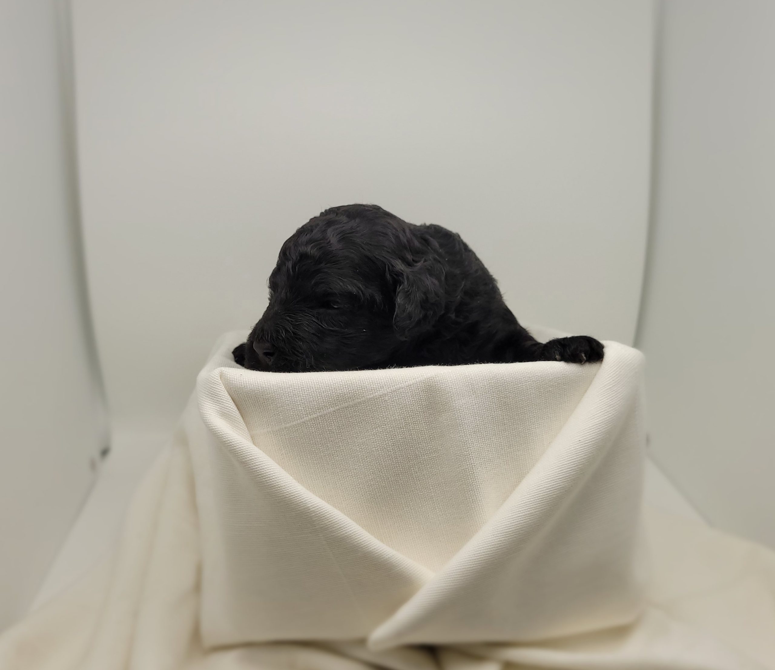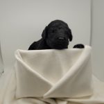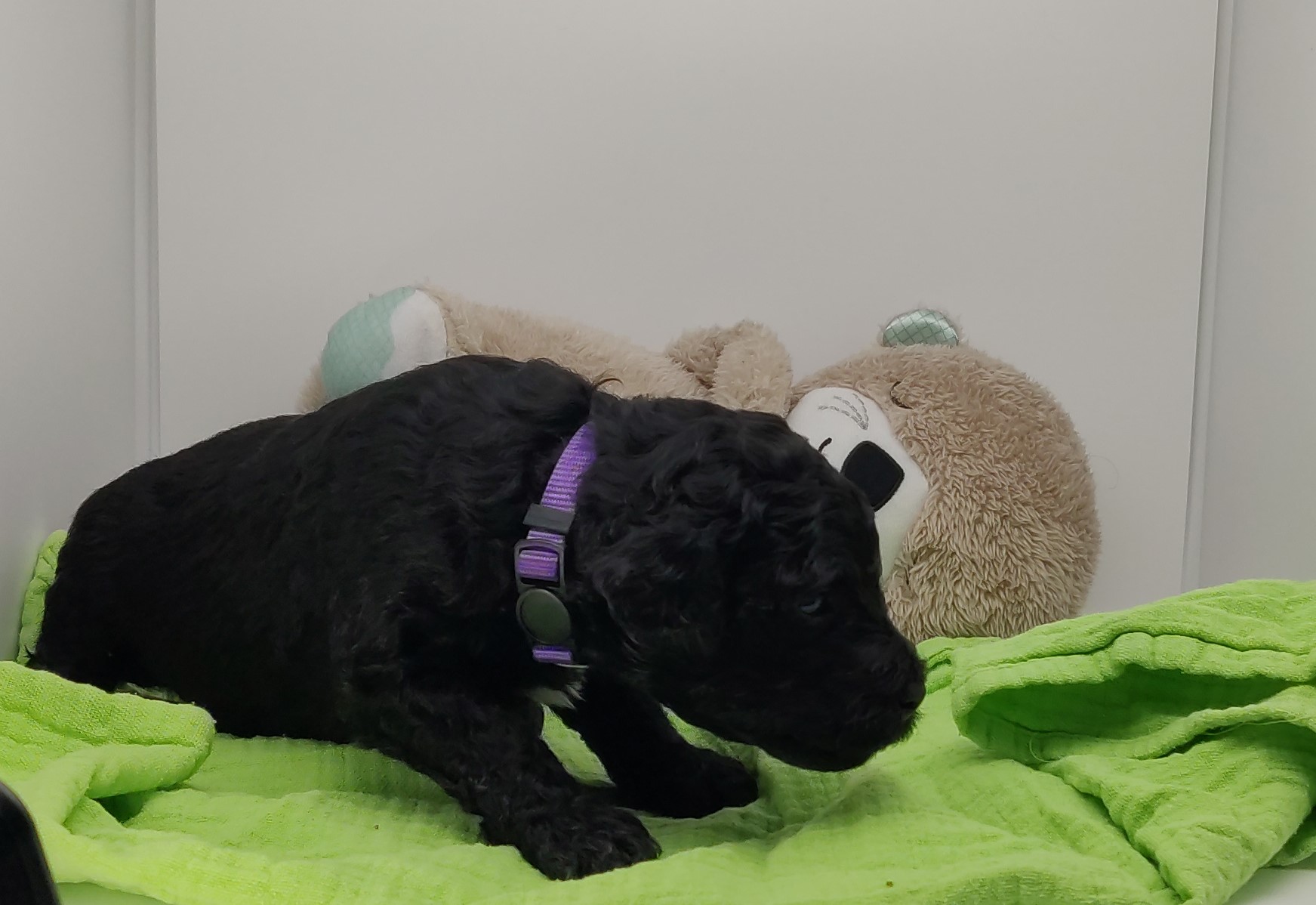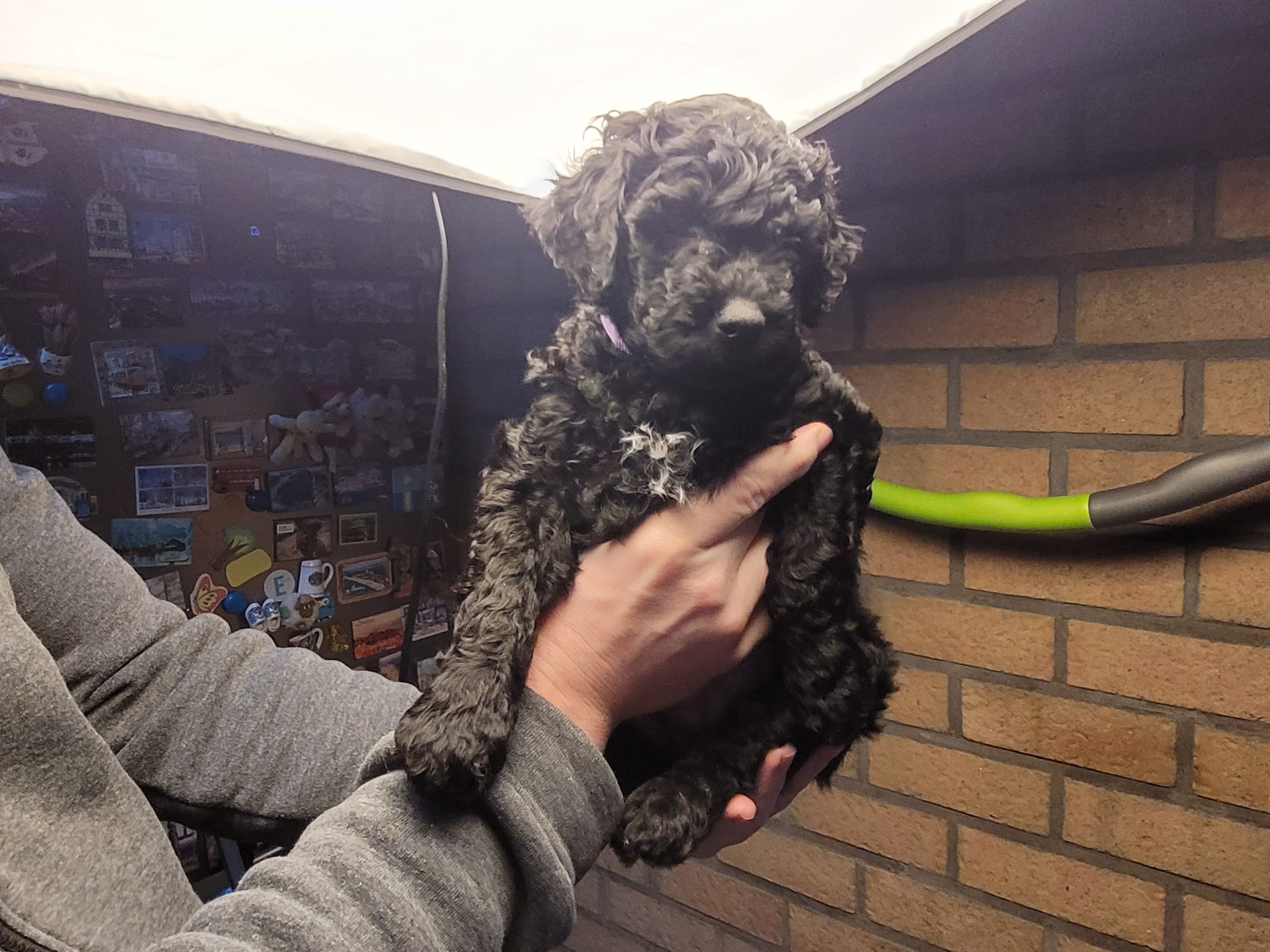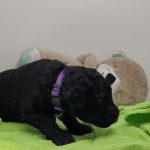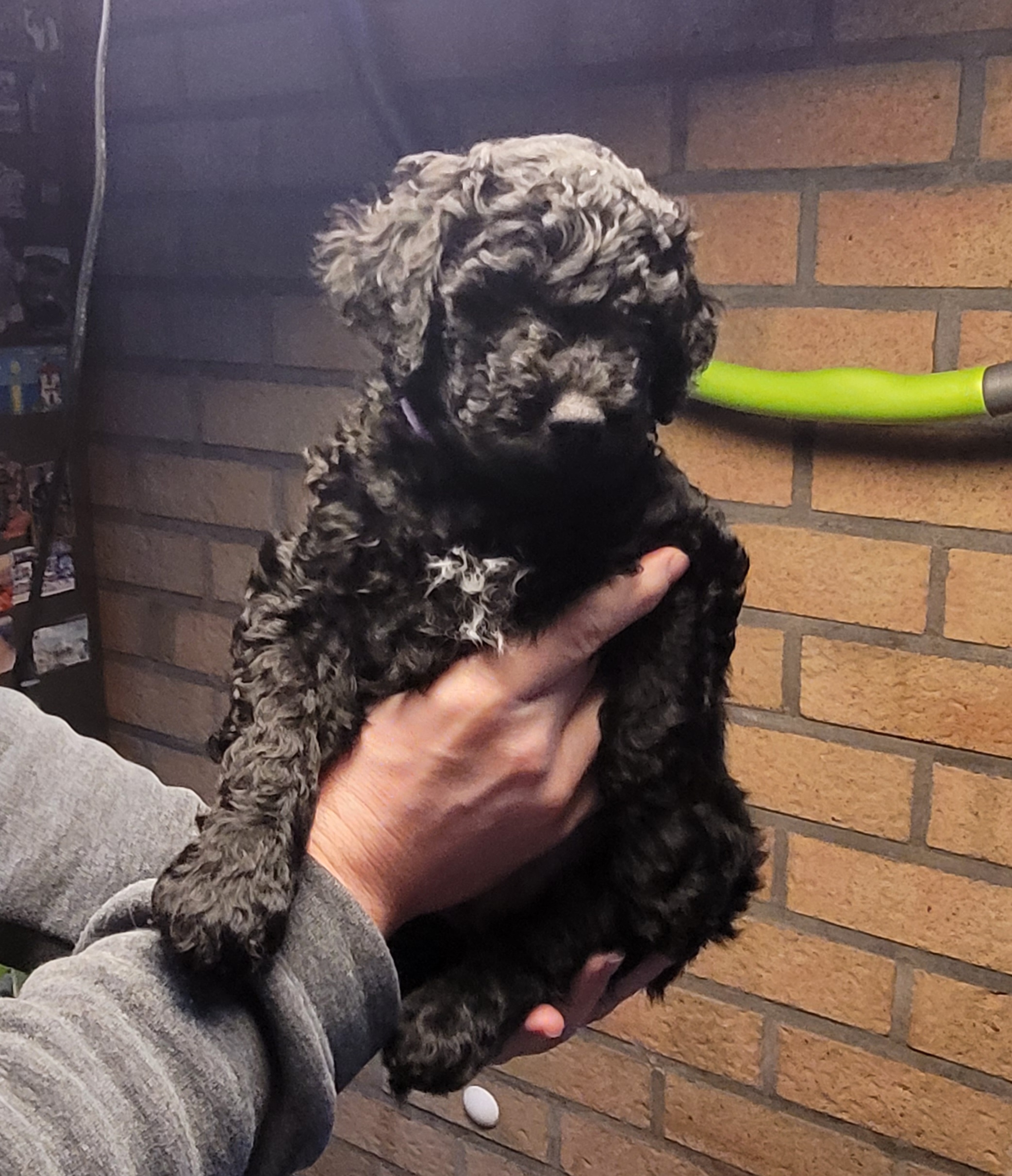 Miss Purple is our most adventurous and brave puppy! She loooves to cuddle and play with her humans but also adores exploring around. She is anticipated to grow into a charming small-medium-sized dog. Miss Purple sports an adorable white spot on her chest and a stunning black curly and wavy coat that adds to her visual appeal. Her coat’s unique texture and rich colour make her strikingly gorgeous, captivating all who meet her. Miss Purple embodies a blend of playful energy and sweetness, making her a joy to interact with. She loves to cuddle just as much as she enjoys frolicking around. With a wonderful disposition, she shows great affection towards her siblings and her people, truly embodying the spirit of a loving and delightful puppy.