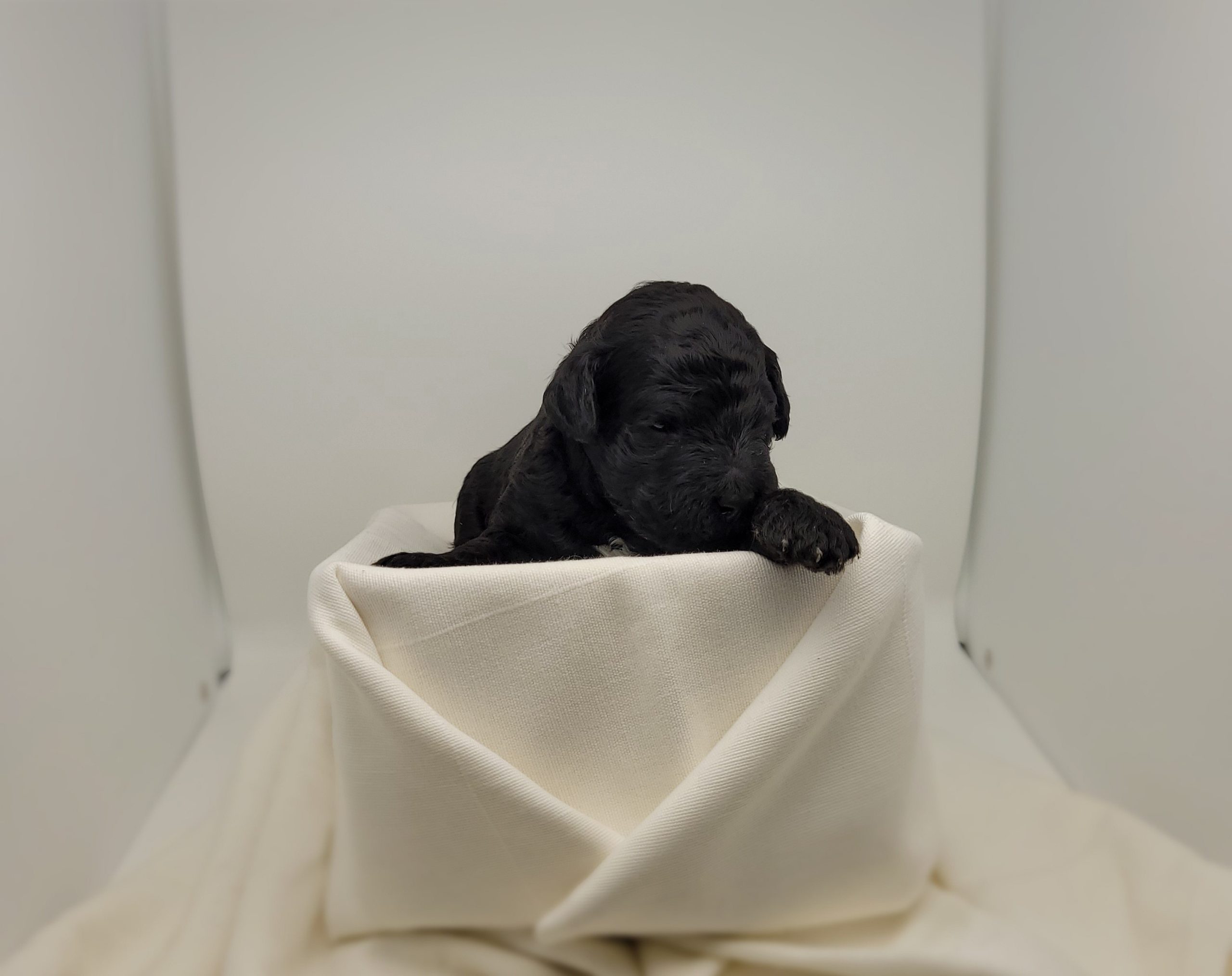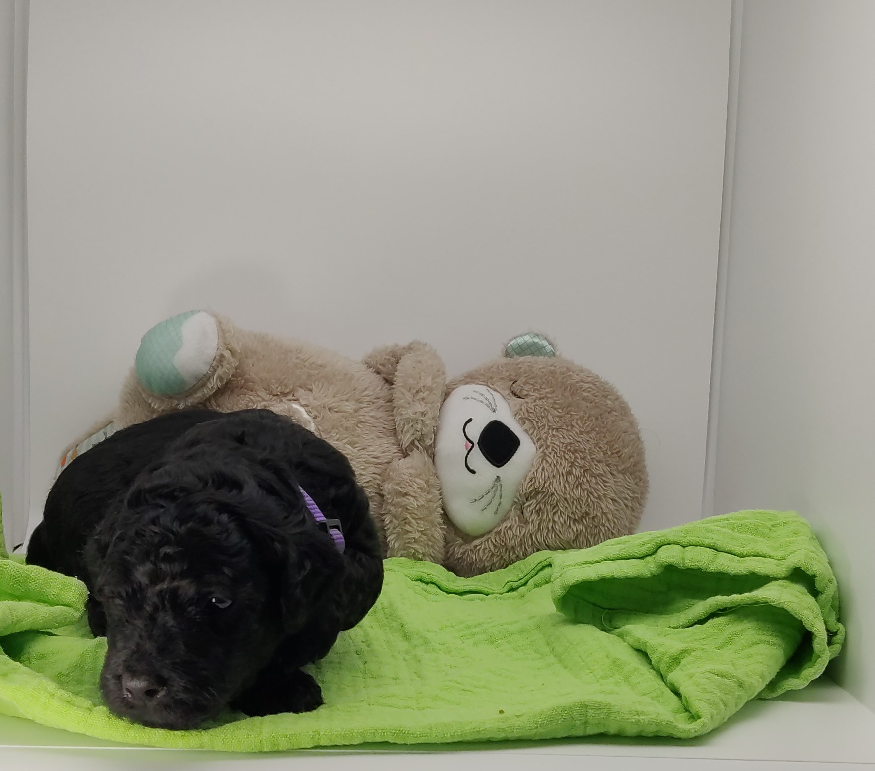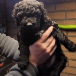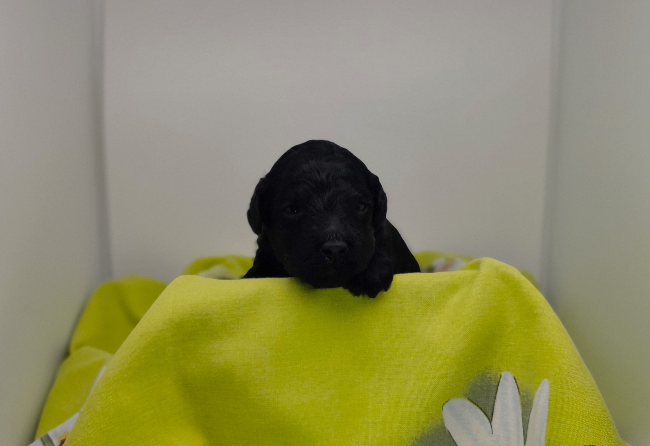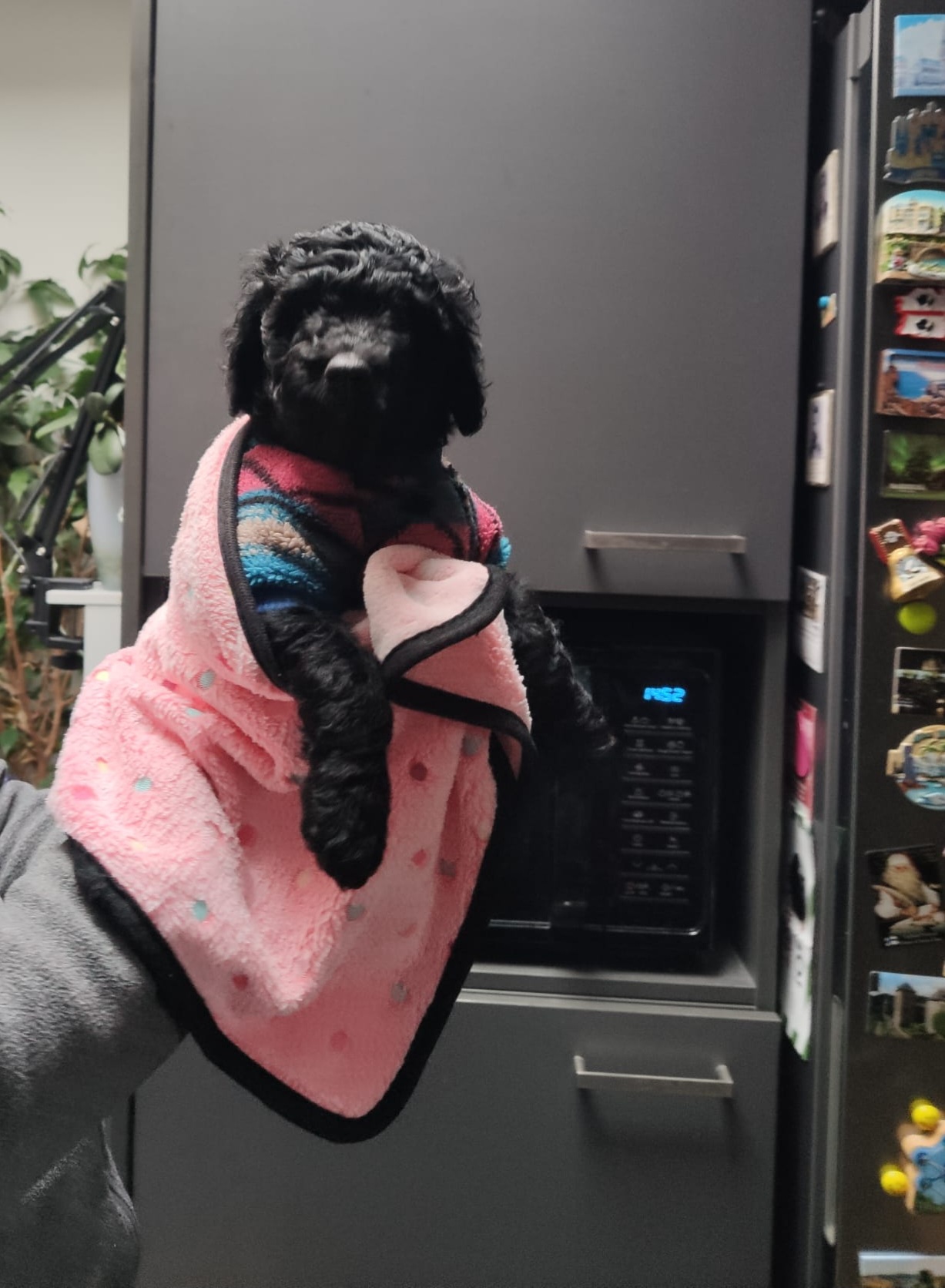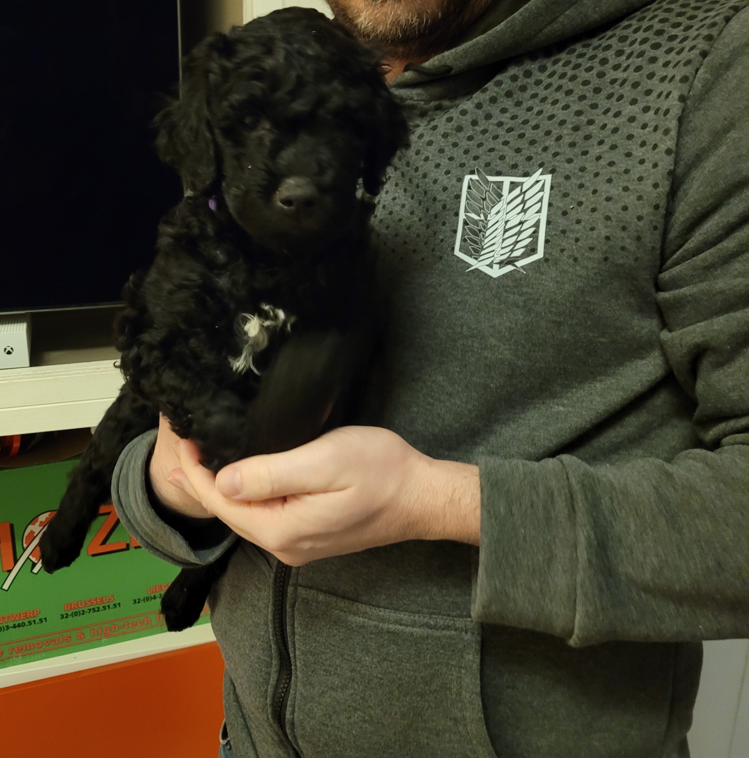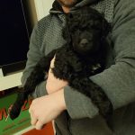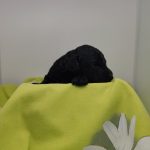 Miss Purple is our most adventurous and brave puppy! She loooves to cuddle and play with her humans but also adores exploring around. She is anticipated to grow into a charming small-medium-sized dog. Miss Purple sports an adorable white spot on her chest and a stunning black curly and wavy coat that adds to her visual appeal. Her coat’s unique texture and rich colour make her strikingly gorgeous, captivating all who meet her. Miss Purple embodies a blend of playful energy and sweetness, making her a joy to interact with. She loves to cuddle just as much as she enjoys frolicking around. With a wonderful disposition, she shows great affection towards her siblings and her people, truly embodying the spirit of a loving and delightful puppy.