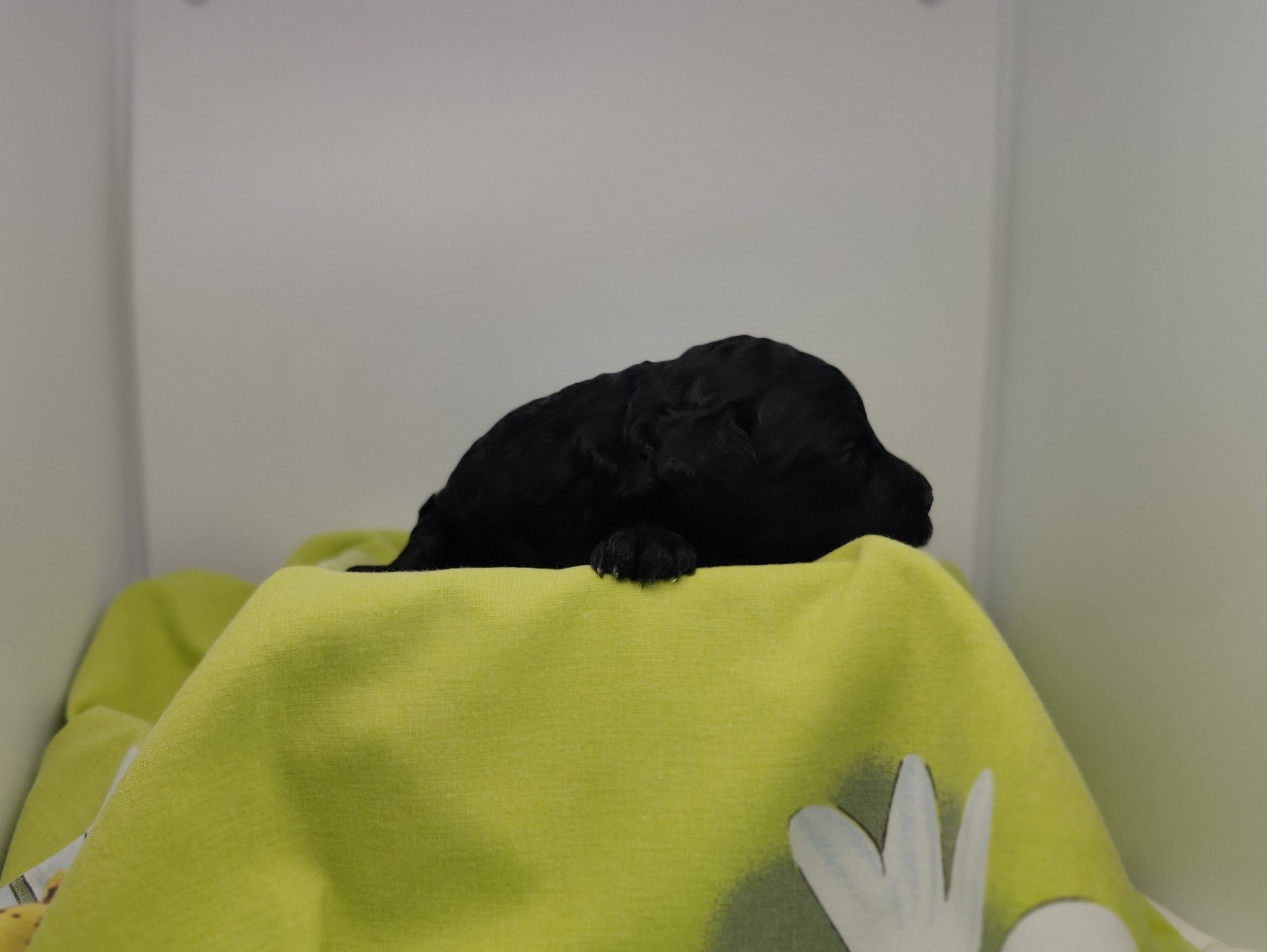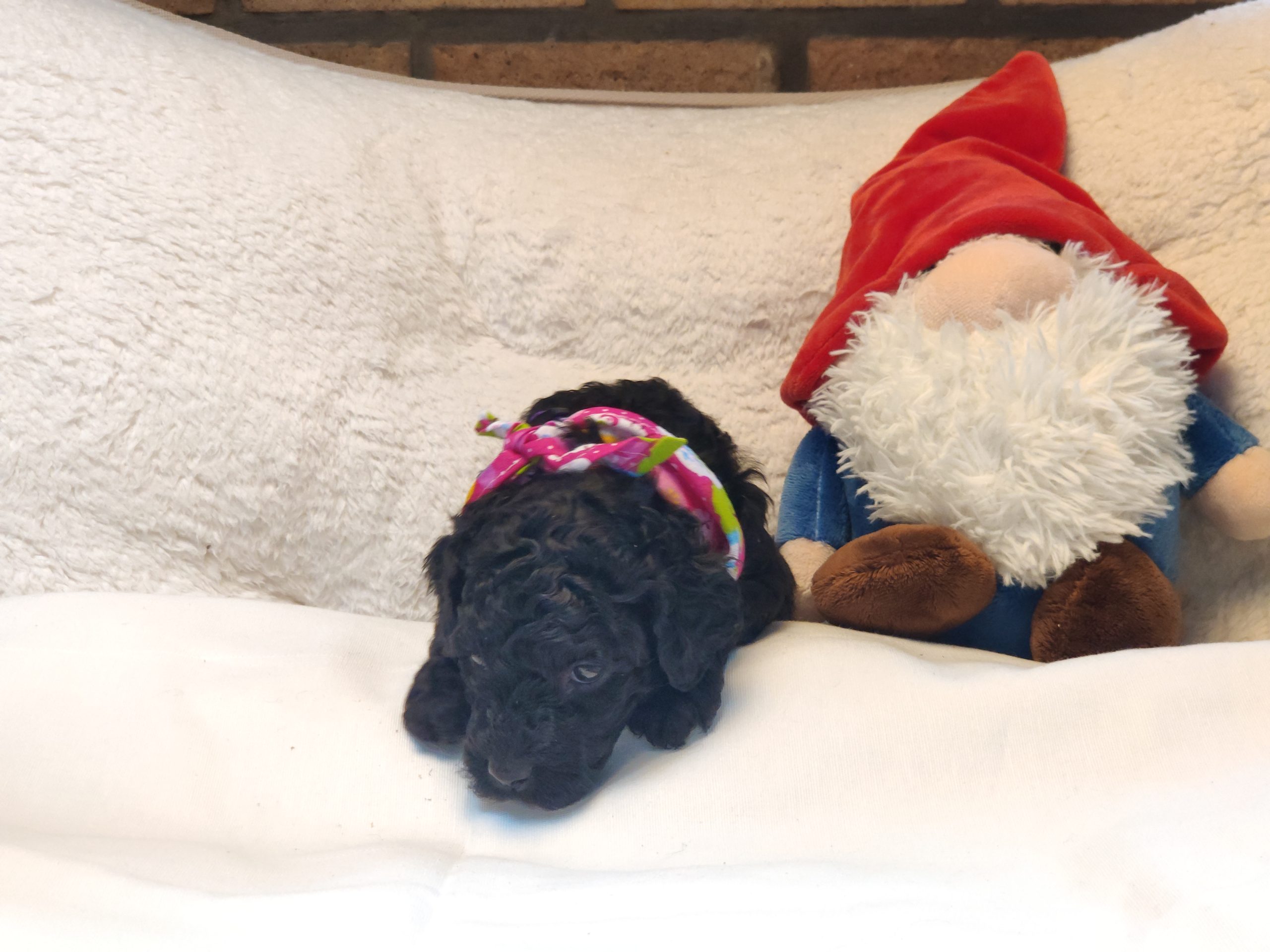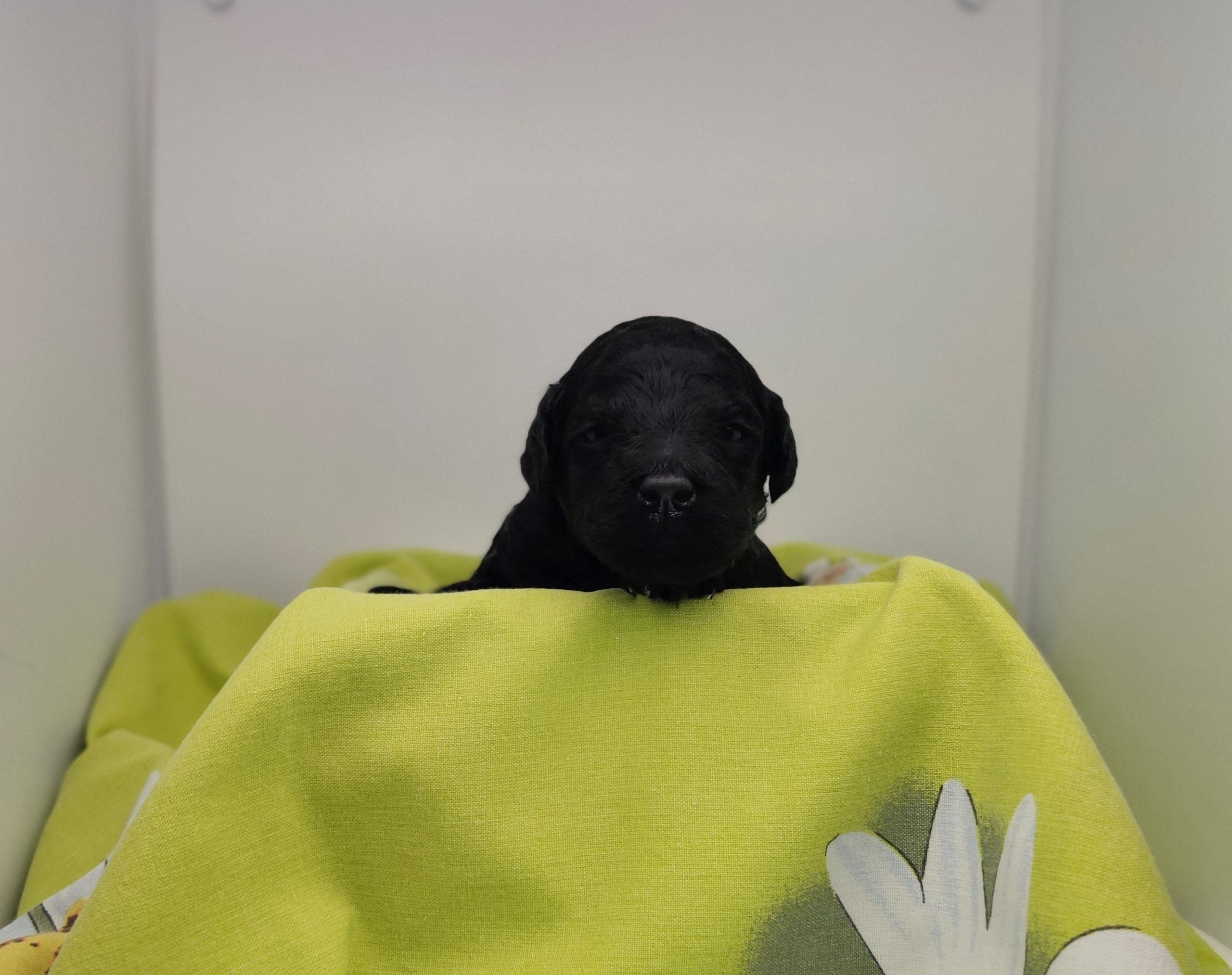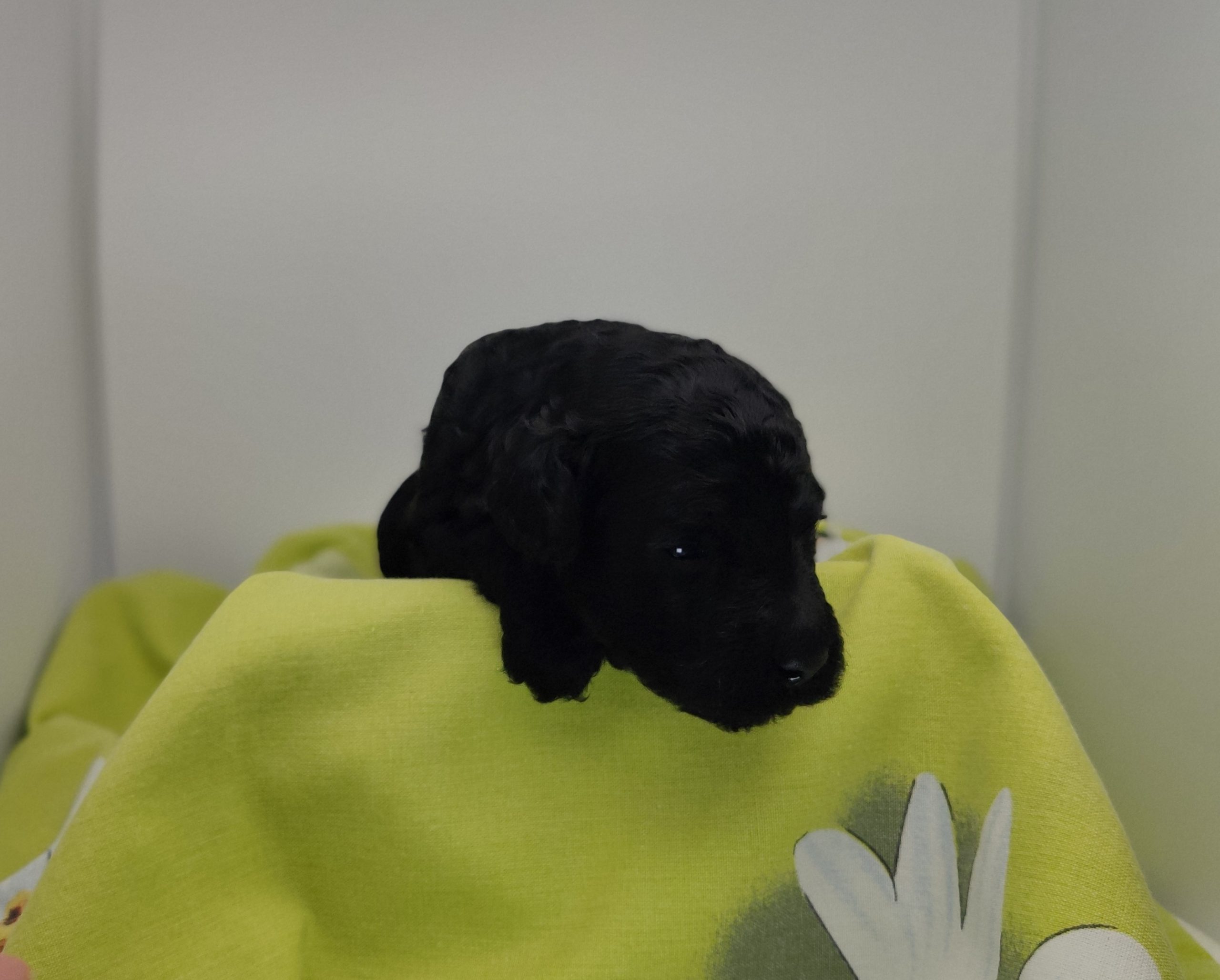 Miss Purple is our most adventurous and brave puppy! She loooves to cuddle and play with her humans but also adores exploring around. She is anticipated to grow into a charming small-medium-sized dog. Miss Purple sports an adorable white spot on her chest and a stunning black curly and wavy coat that adds to her visual appeal. Her coat’s unique texture and rich colour make her strikingly gorgeous, captivating all who meet her. Miss Purple embodies a blend of playful energy and sweetness, making her a joy to interact with. She loves to cuddle just as much as she enjoys frolicking around. With a wonderful disposition, she shows great affection towards her siblings and her people, truly embodying the spirit of a loving and delightful puppy.