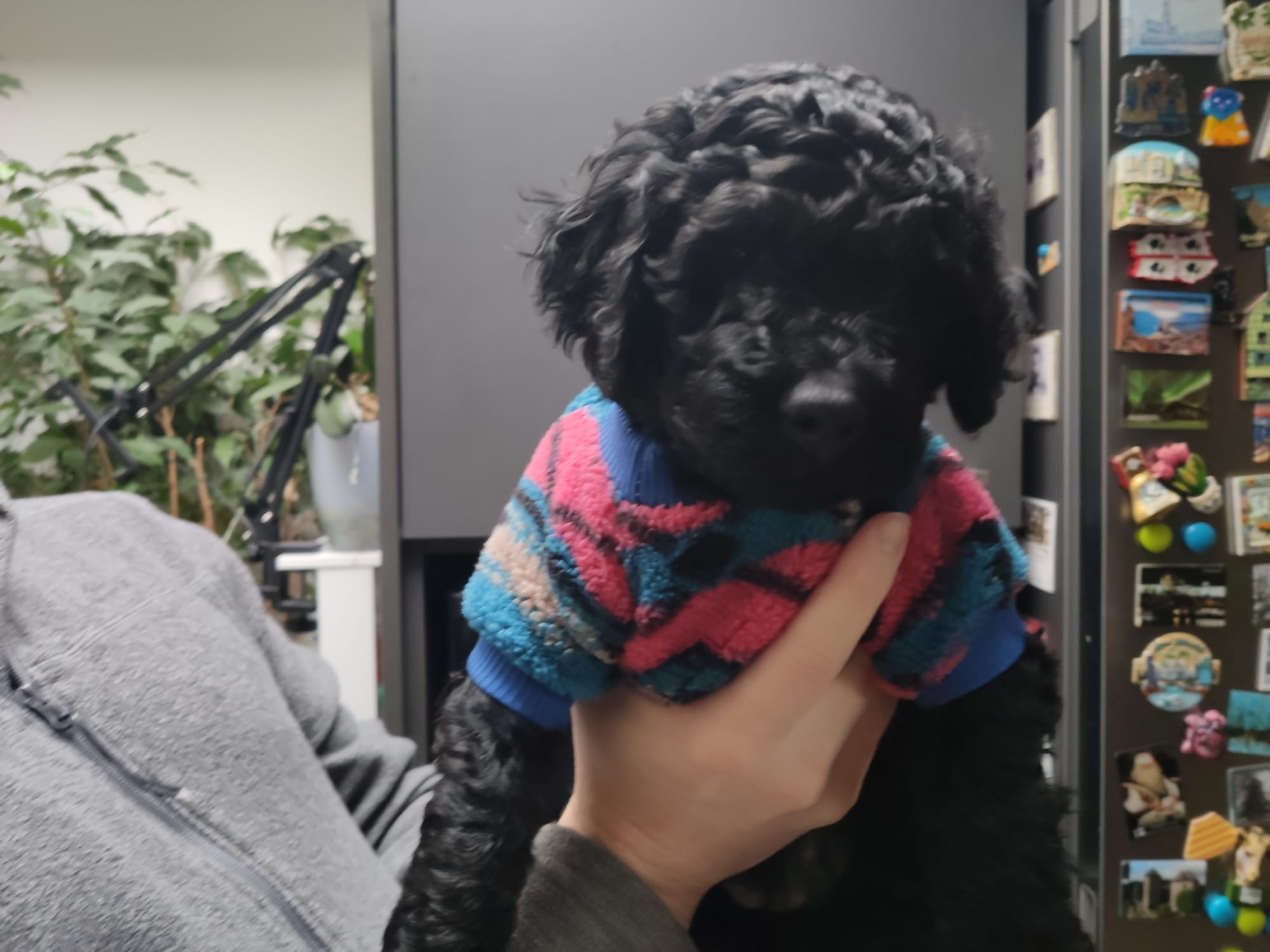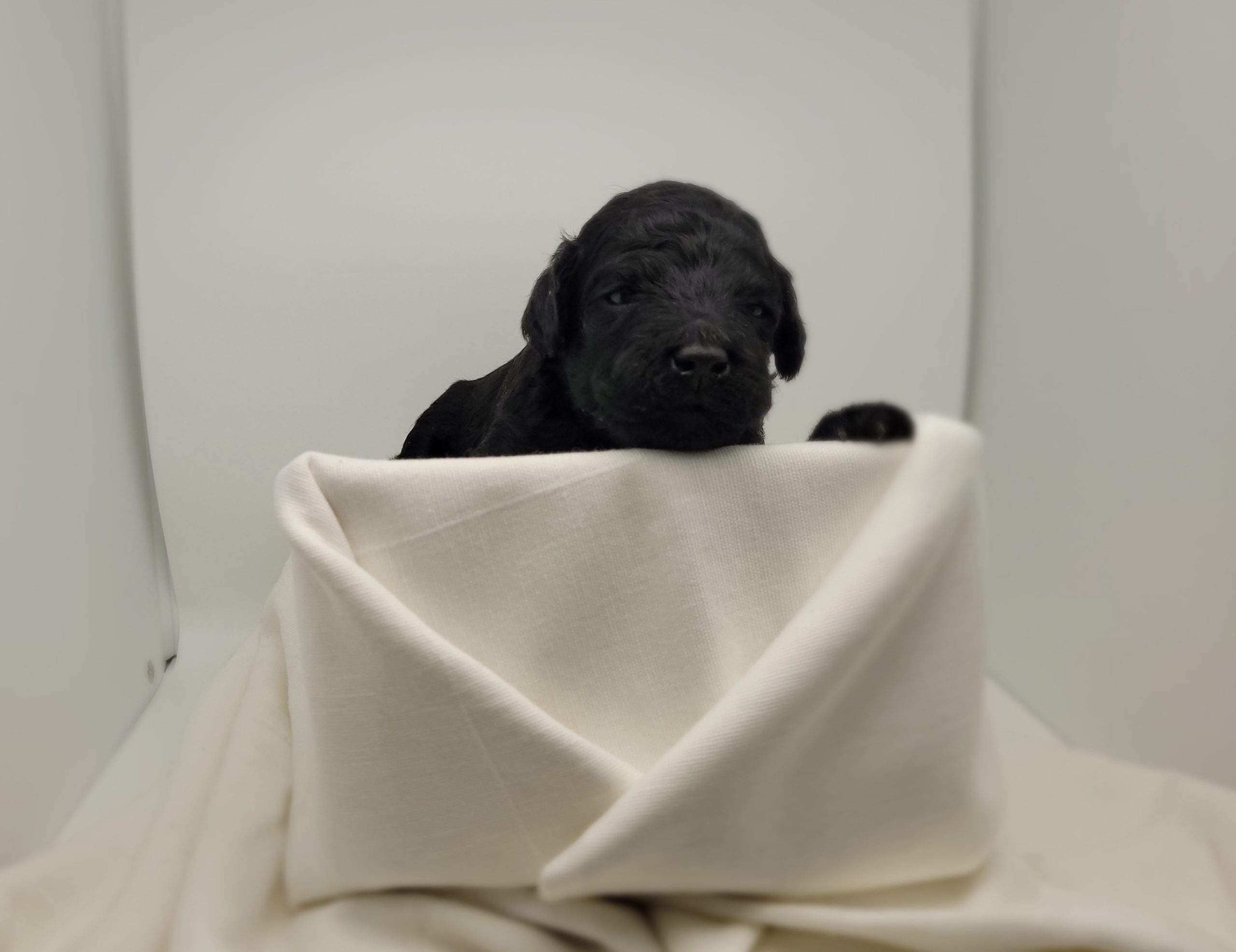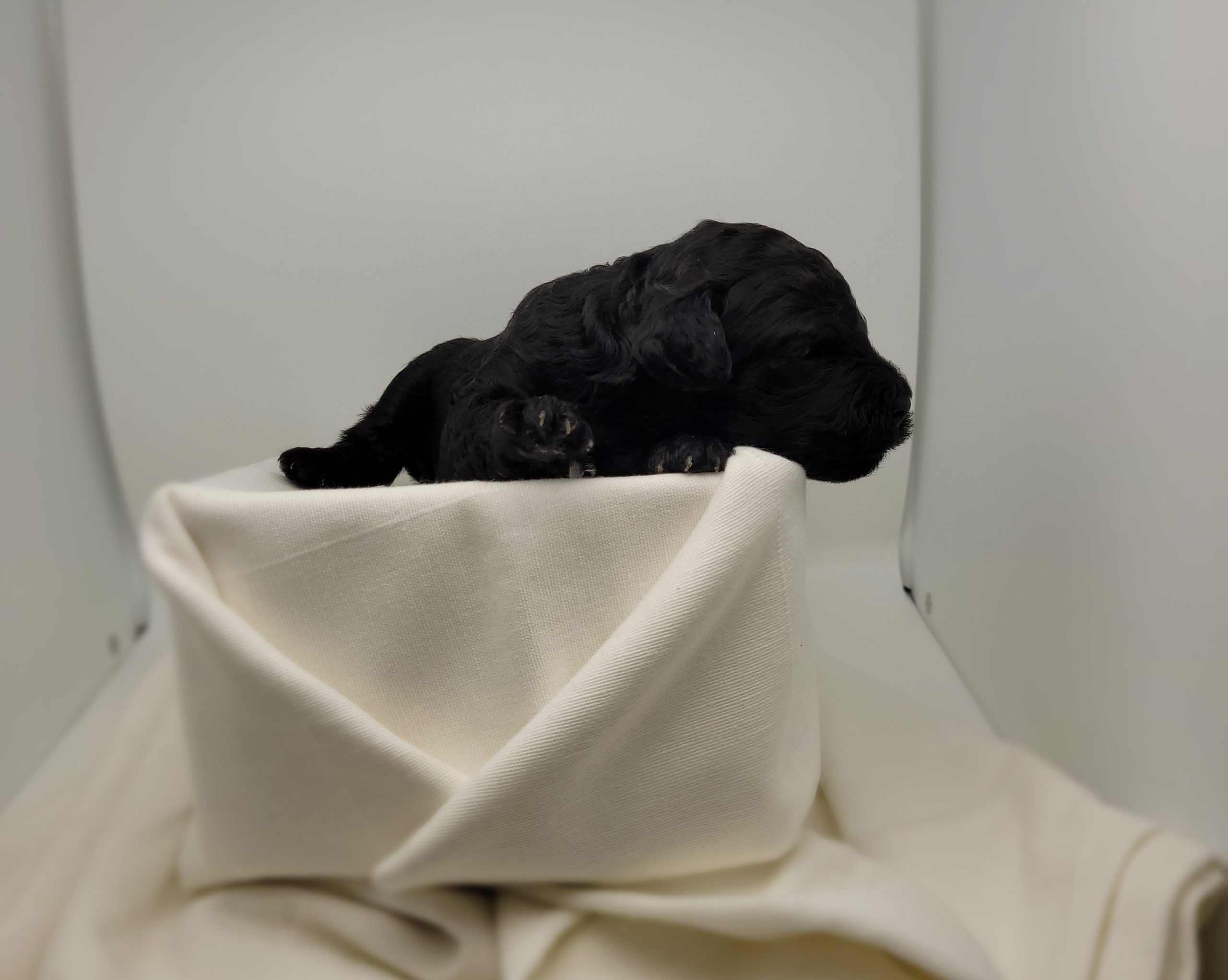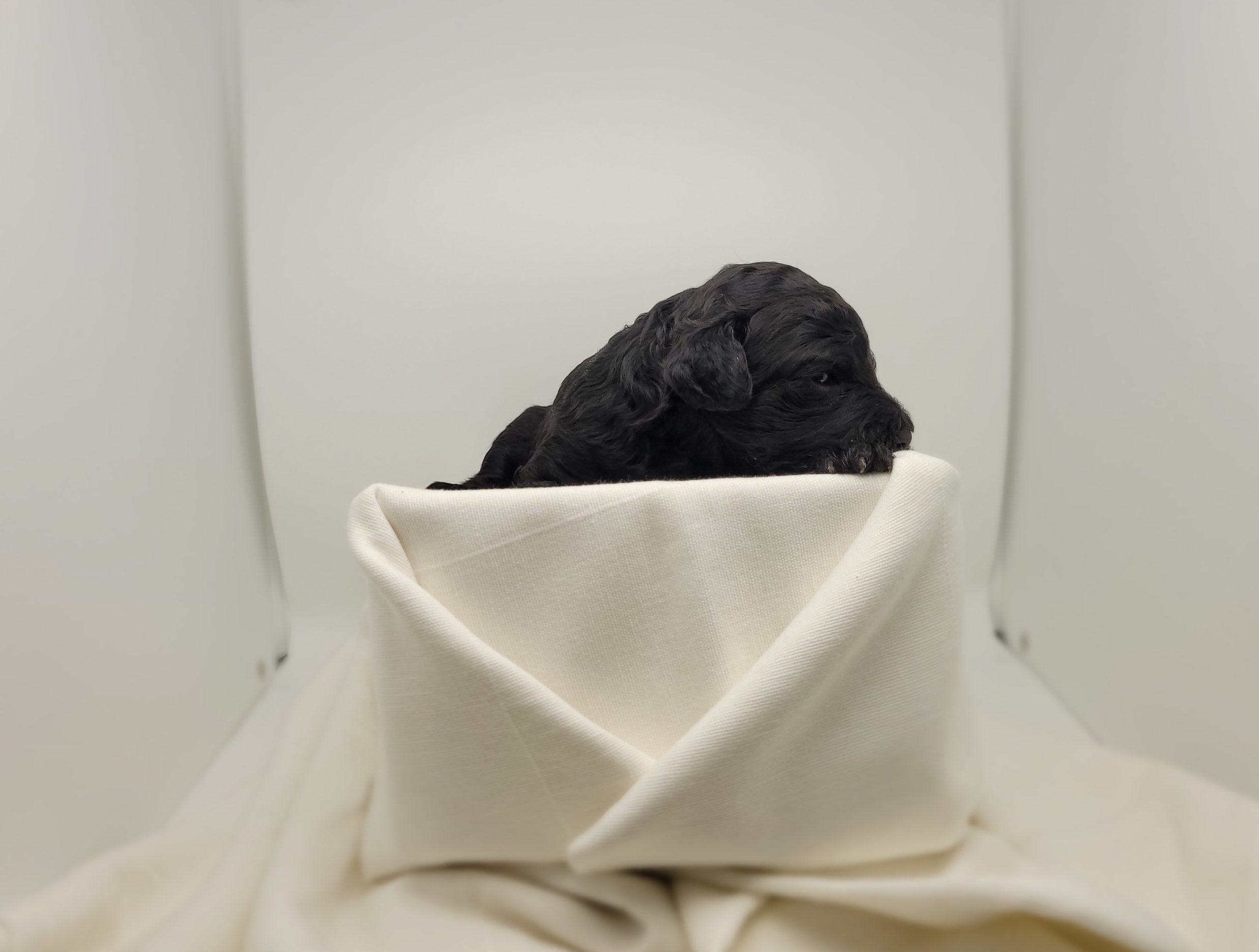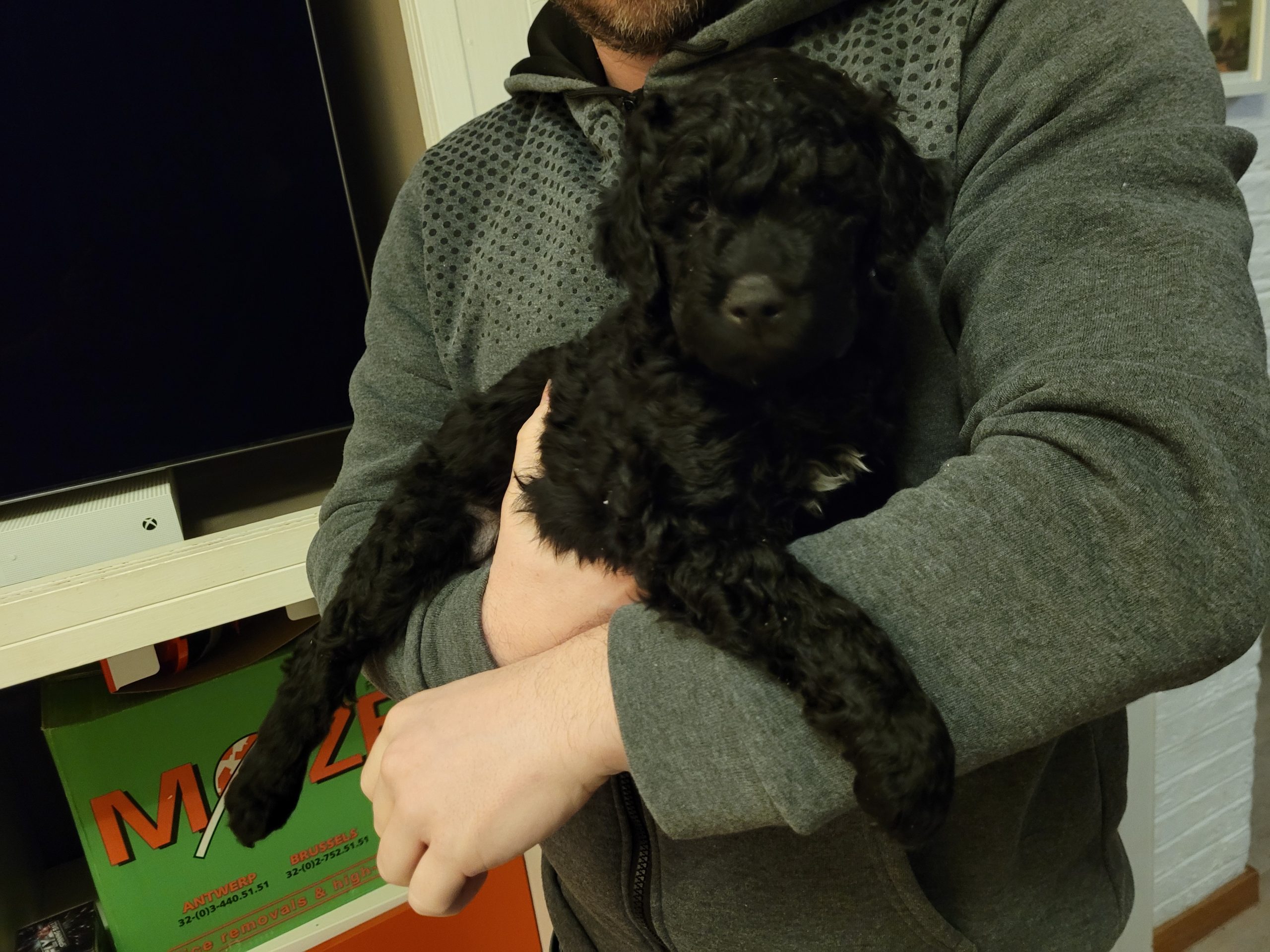 Miss Purple is our most adventurous and brave puppy! She loooves to cuddle and play with her humans but also adores exploring around. She is anticipated to grow into a charming small-medium-sized dog. Miss Purple sports an adorable white spot on her chest and a stunning black curly and wavy coat that adds to her visual appeal. Her coat’s unique texture and rich colour make her strikingly gorgeous, captivating all who meet her. Miss Purple embodies a blend of playful energy and sweetness, making her a joy to interact with. She loves to cuddle just as much as she enjoys frolicking around. With a wonderful disposition, she shows great affection towards her siblings and her people, truly embodying the spirit of a loving and delightful puppy.