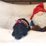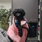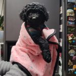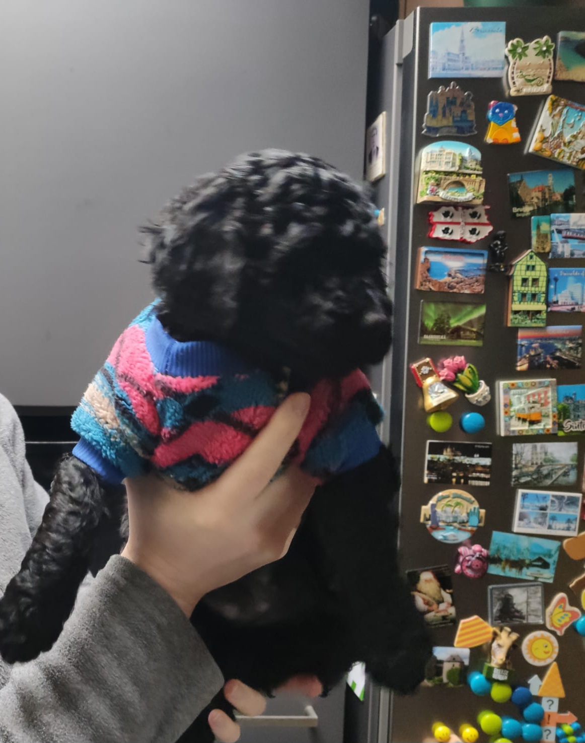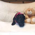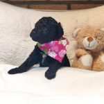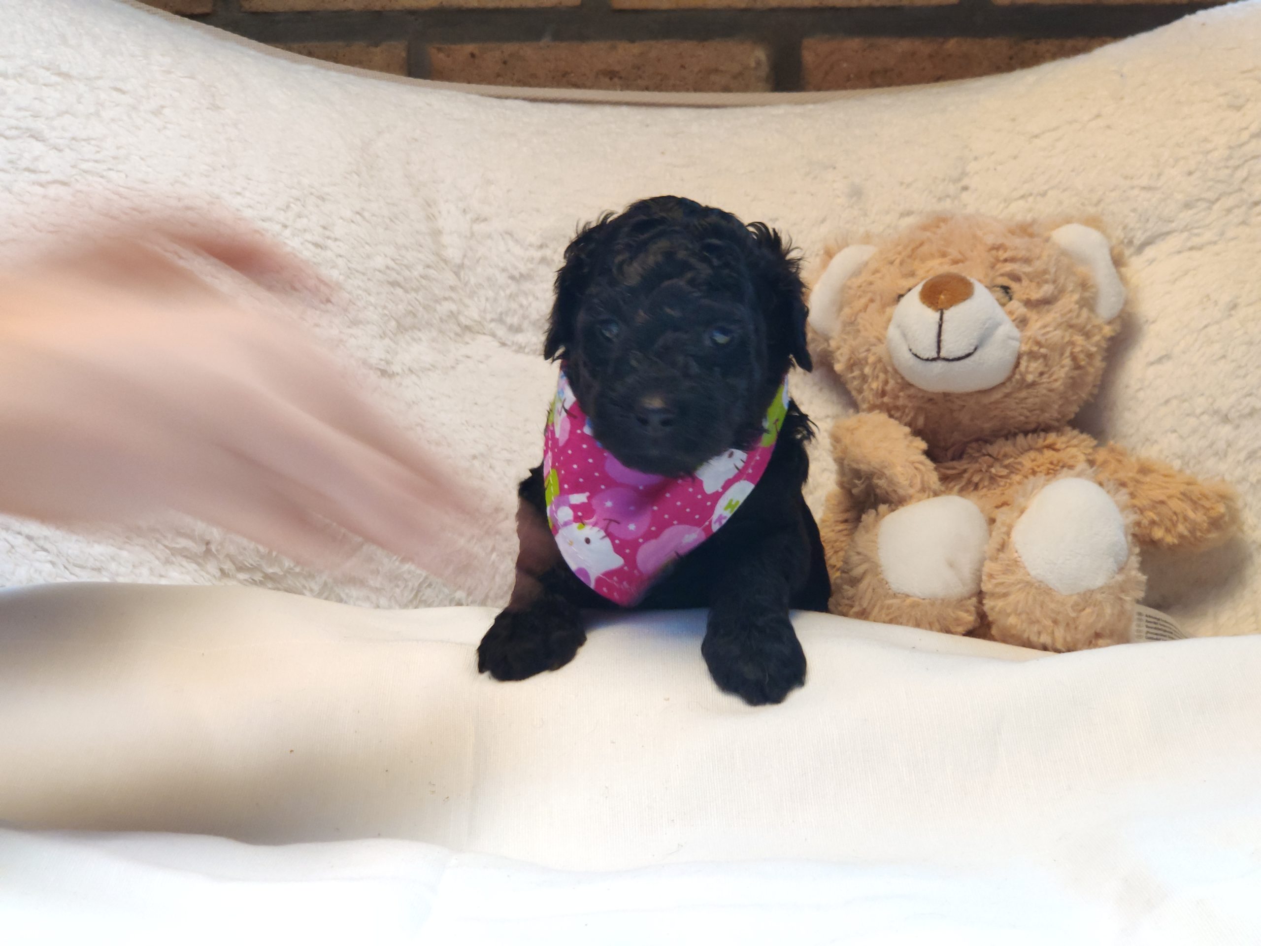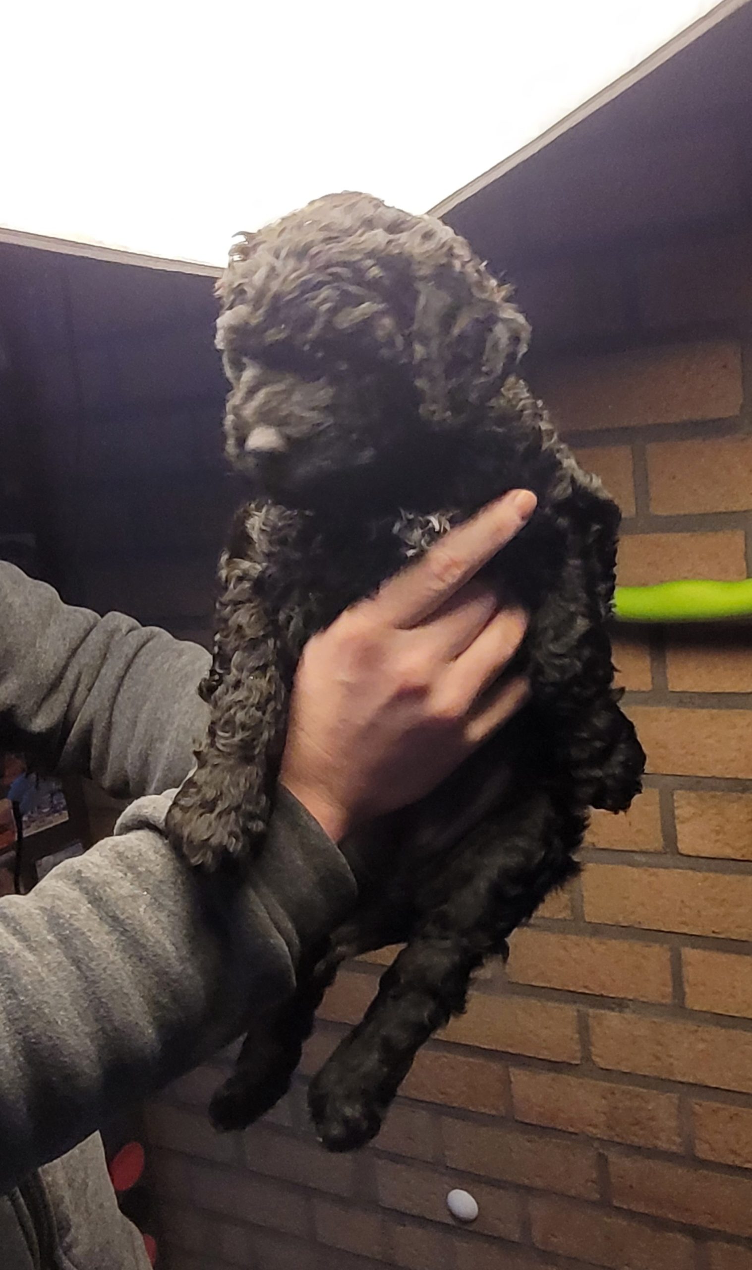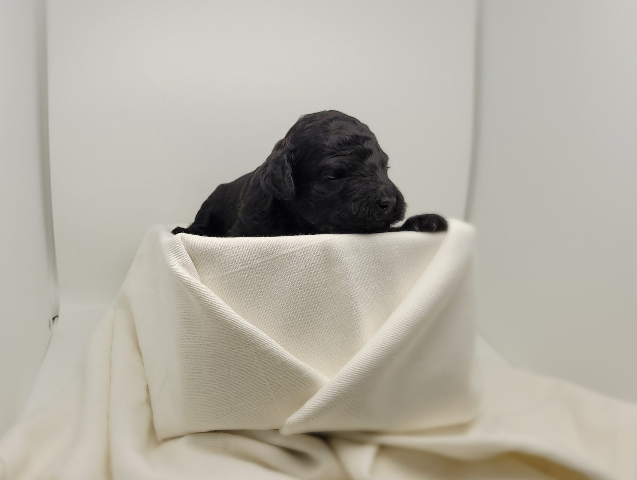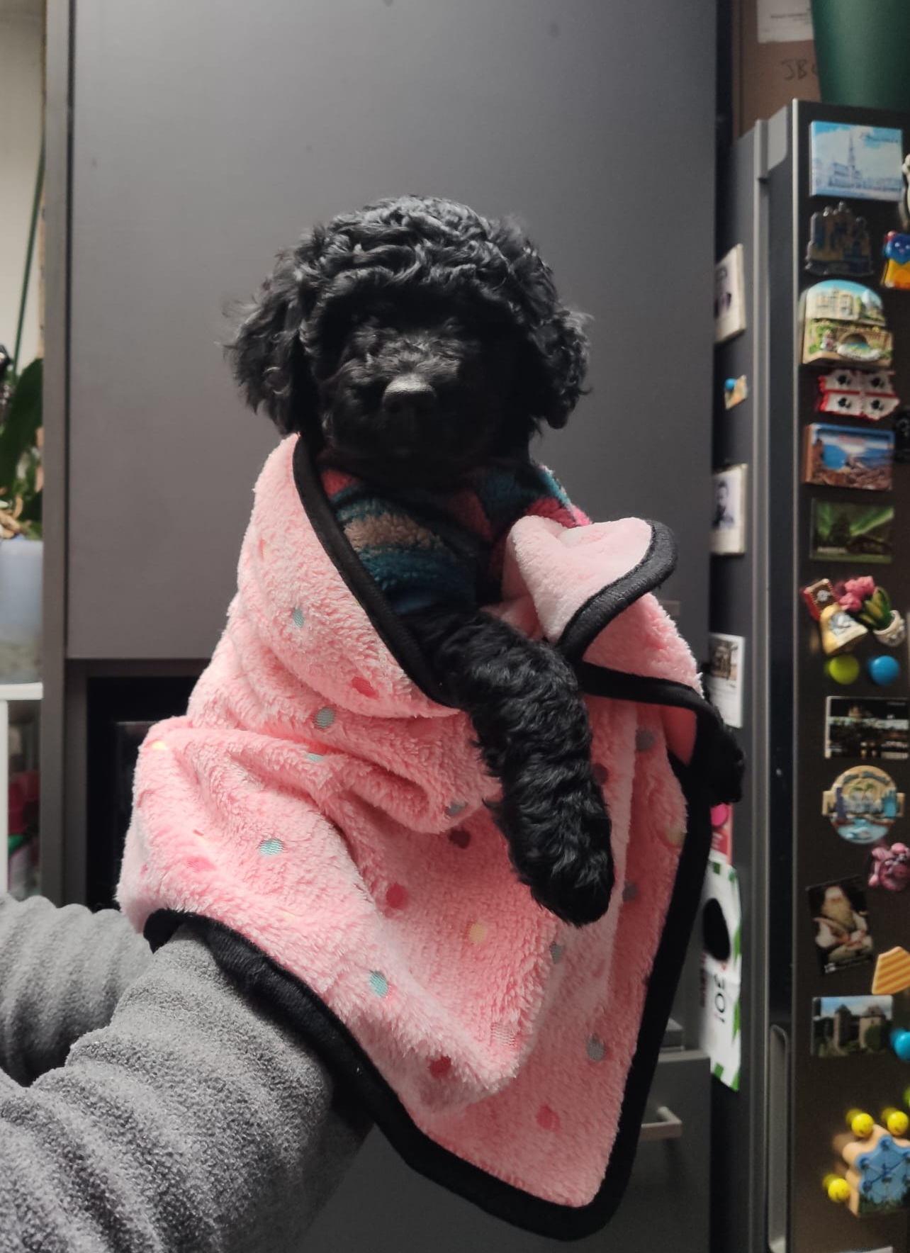 Miss Purple is our most adventurous and brave puppy! She loooves to cuddle and play with her humans but also adores exploring around. She is anticipated to grow into a charming small-medium-sized dog. Miss Purple sports an adorable white spot on her chest and a stunning black curly and wavy coat that adds to her visual appeal. Her coat’s unique texture and rich colour make her strikingly gorgeous, captivating all who meet her. Miss Purple embodies a blend of playful energy and sweetness, making her a joy to interact with. She loves to cuddle just as much as she enjoys frolicking around. With a wonderful disposition, she shows great affection towards her siblings and her people, truly embodying the spirit of a loving and delightful puppy.