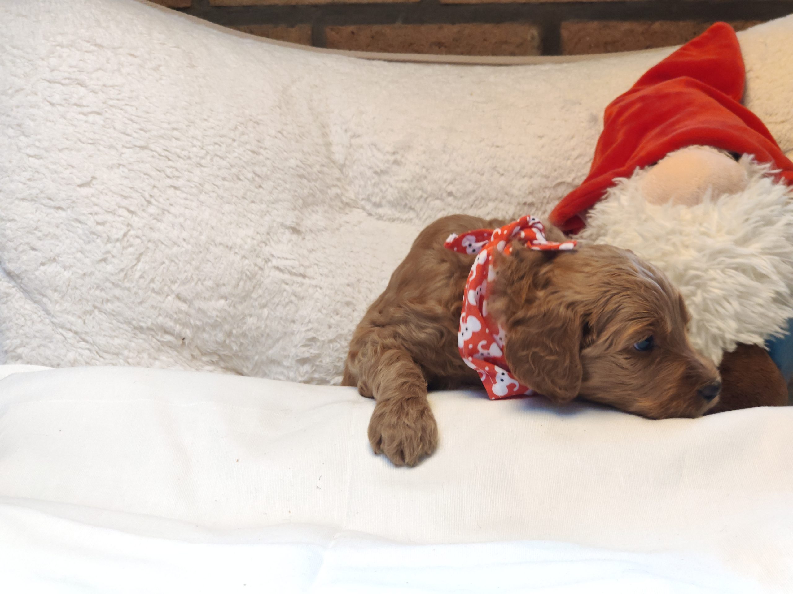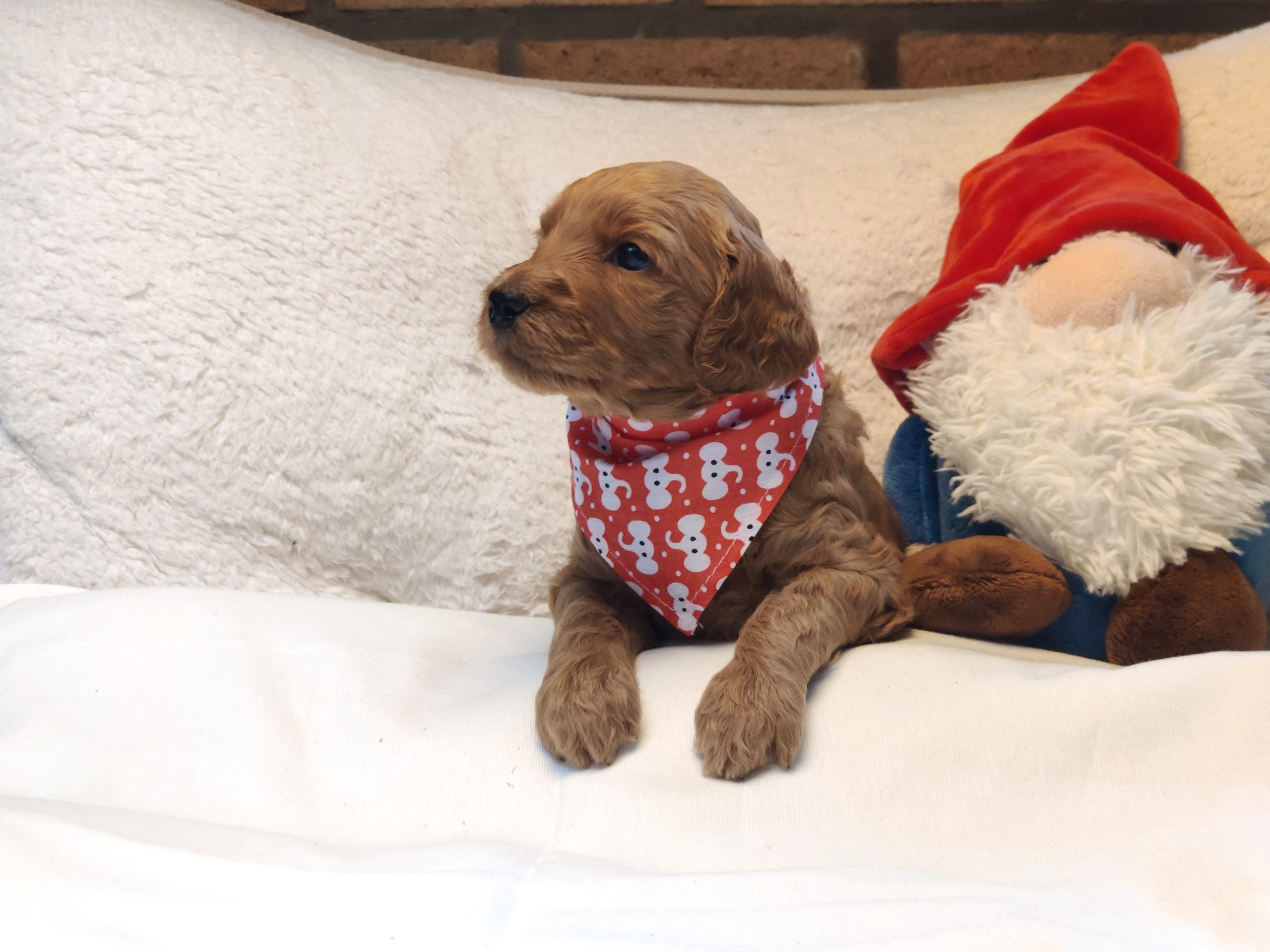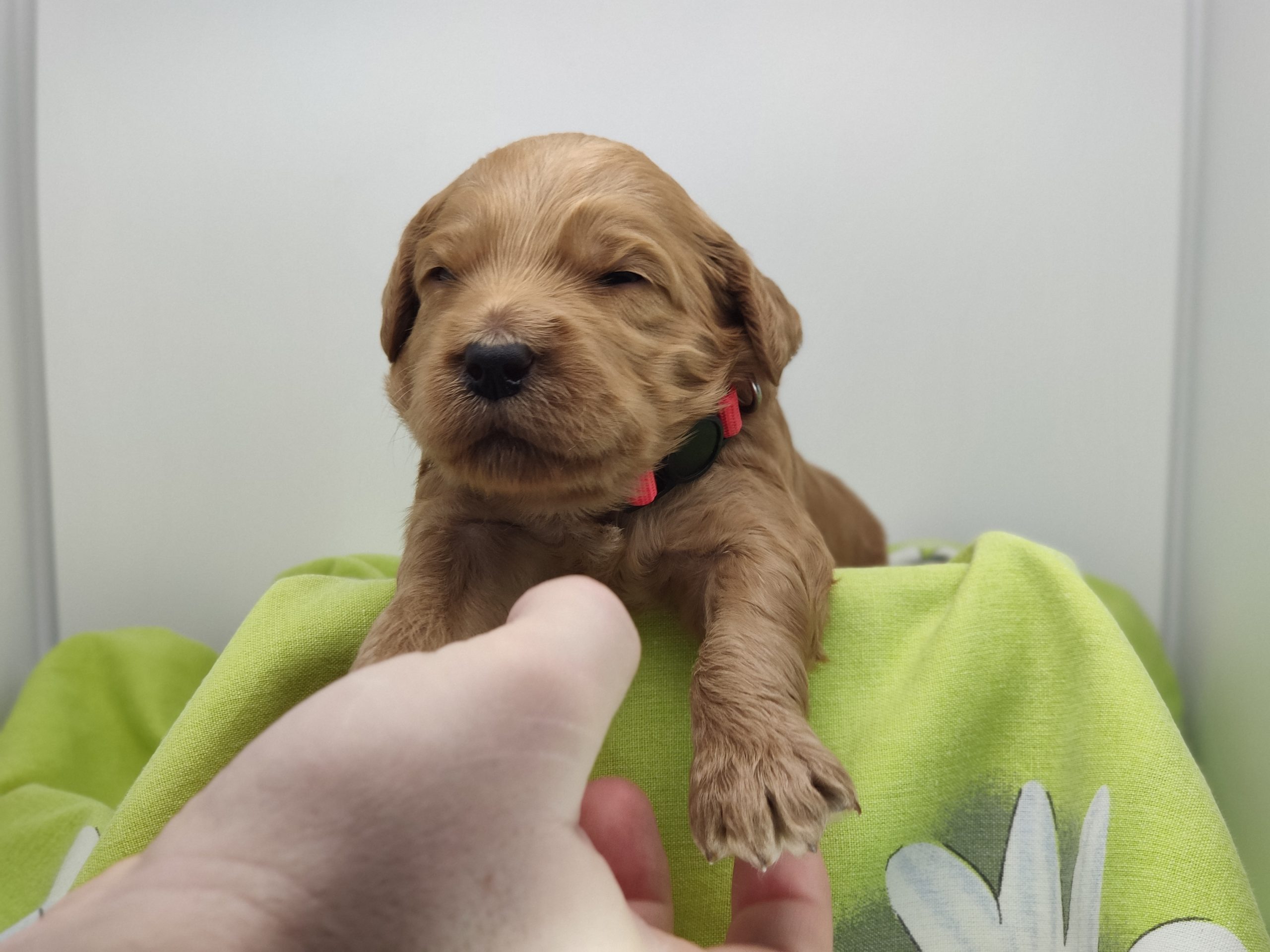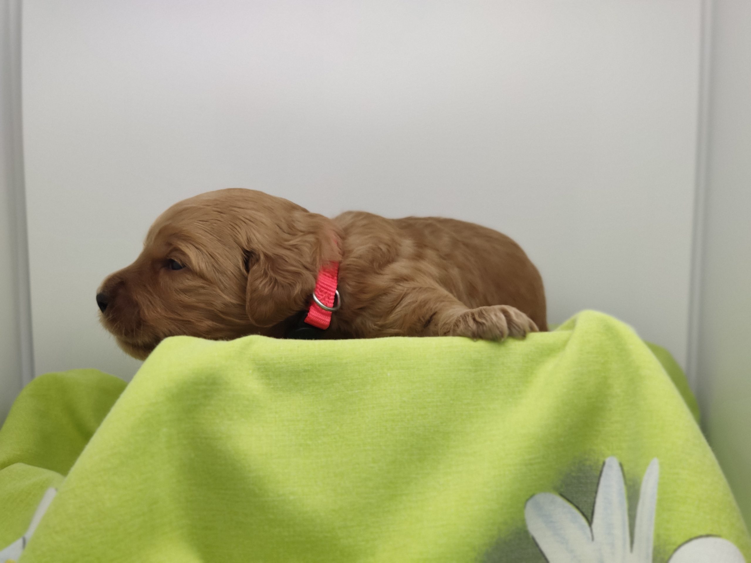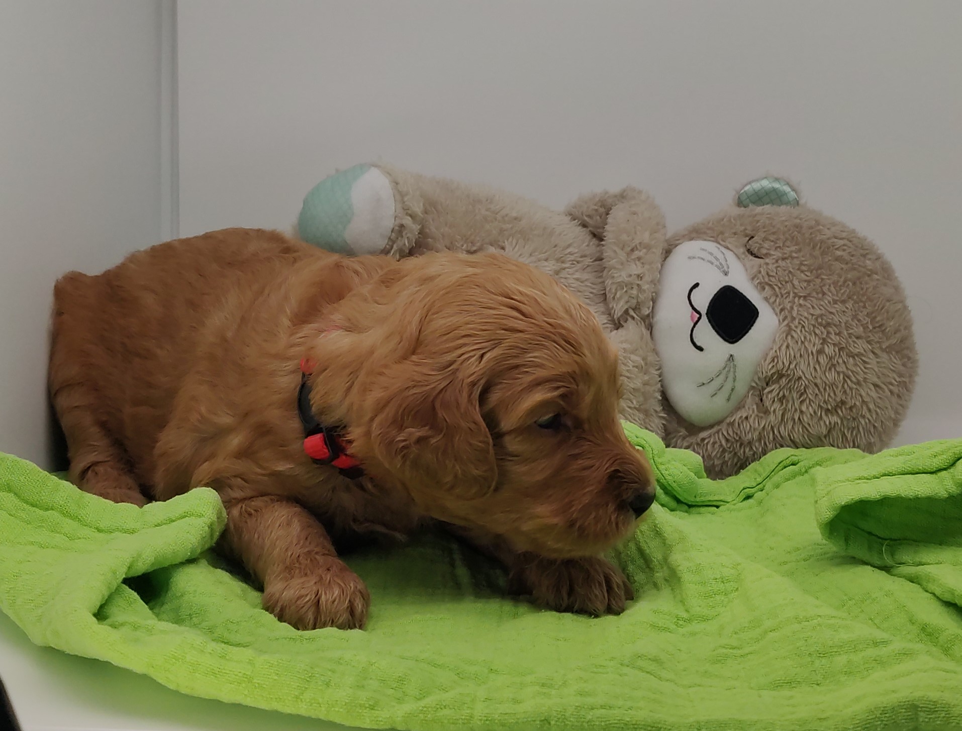 Miss Red stands out with her striking red coat, blending beauty with a serene temperament. She embodies the perfect balance of relaxation and playfulness, making her an endearing presence in any setting. She loooves to cuddle and play with her people. Known for her intelligence, Miss Red is not just a pretty face; she is clever and quick to learn new things. Her love for cuddles and her people highlights her affectionate nature, making her a beloved and brilliant companion who enriches the lives of those around her. She is a gorgeous puppy who is a pure joy to be around.