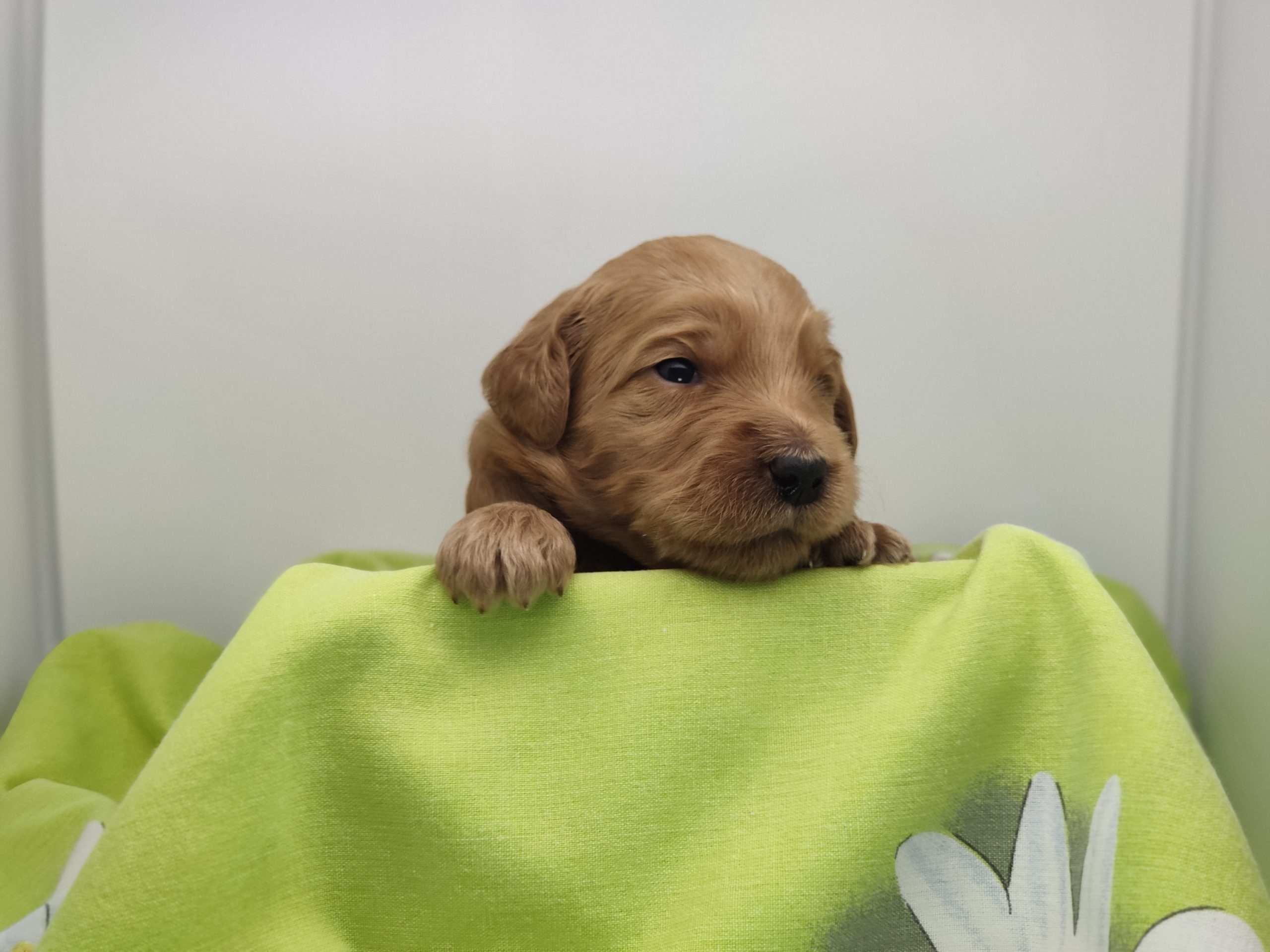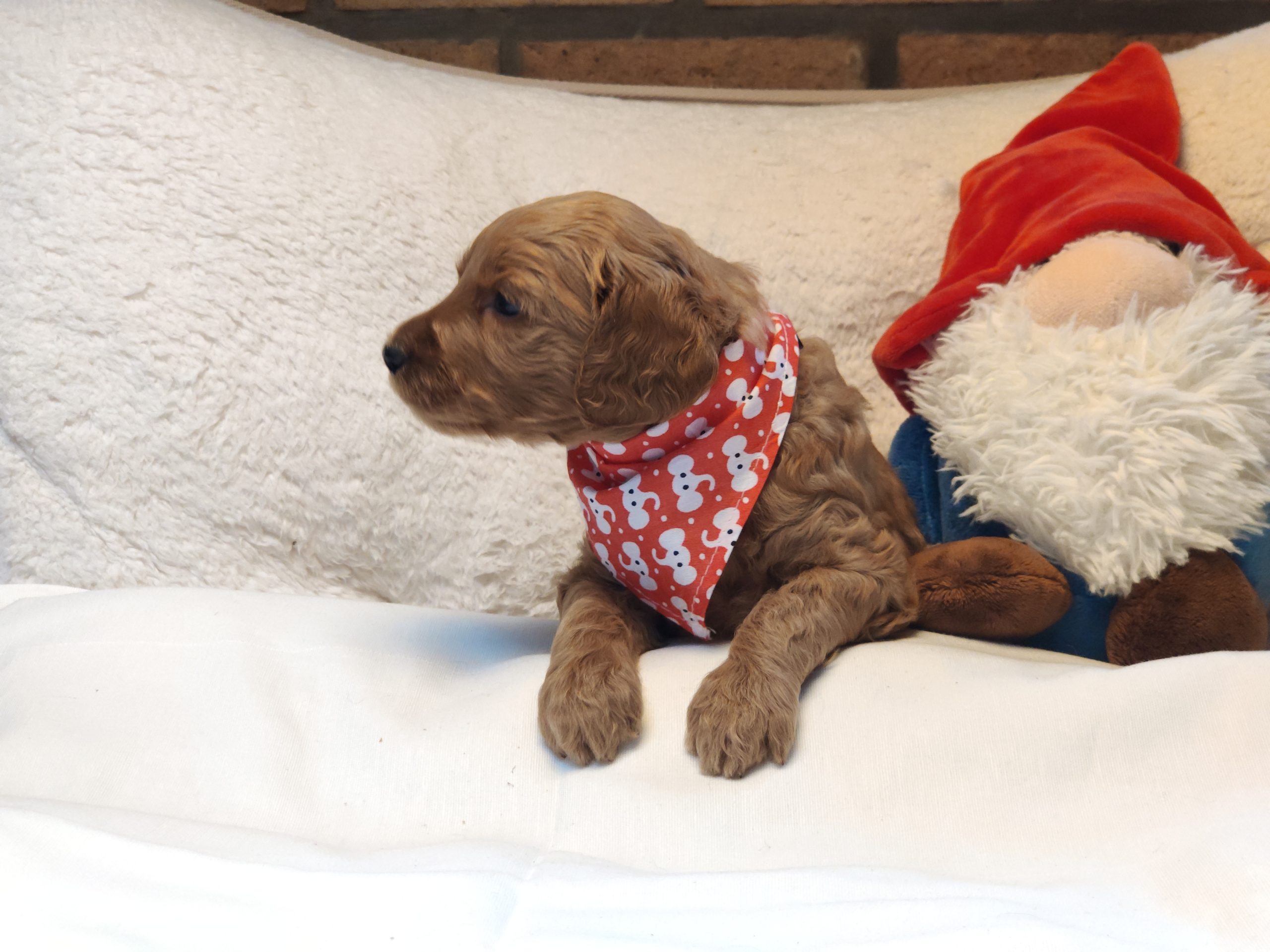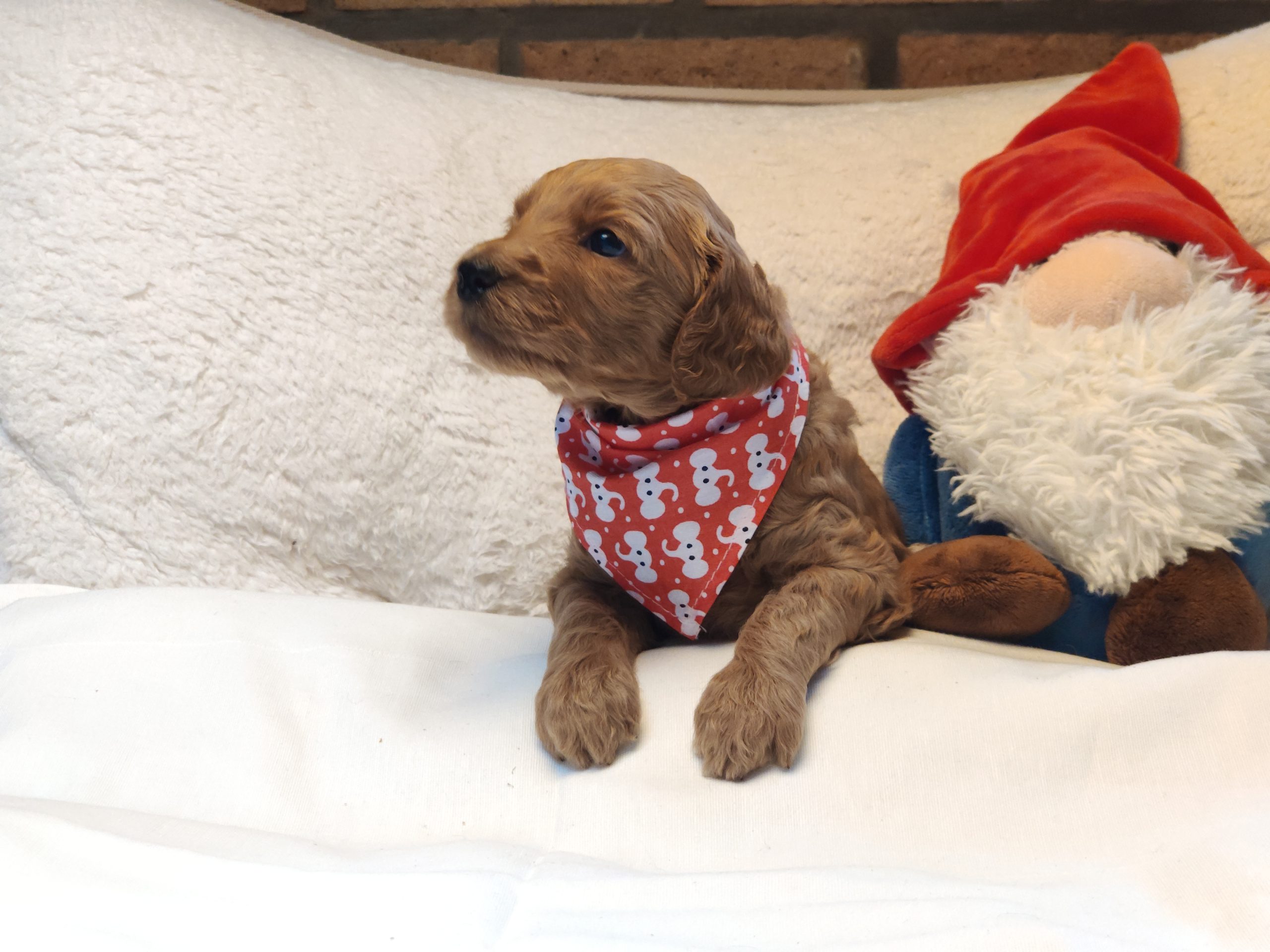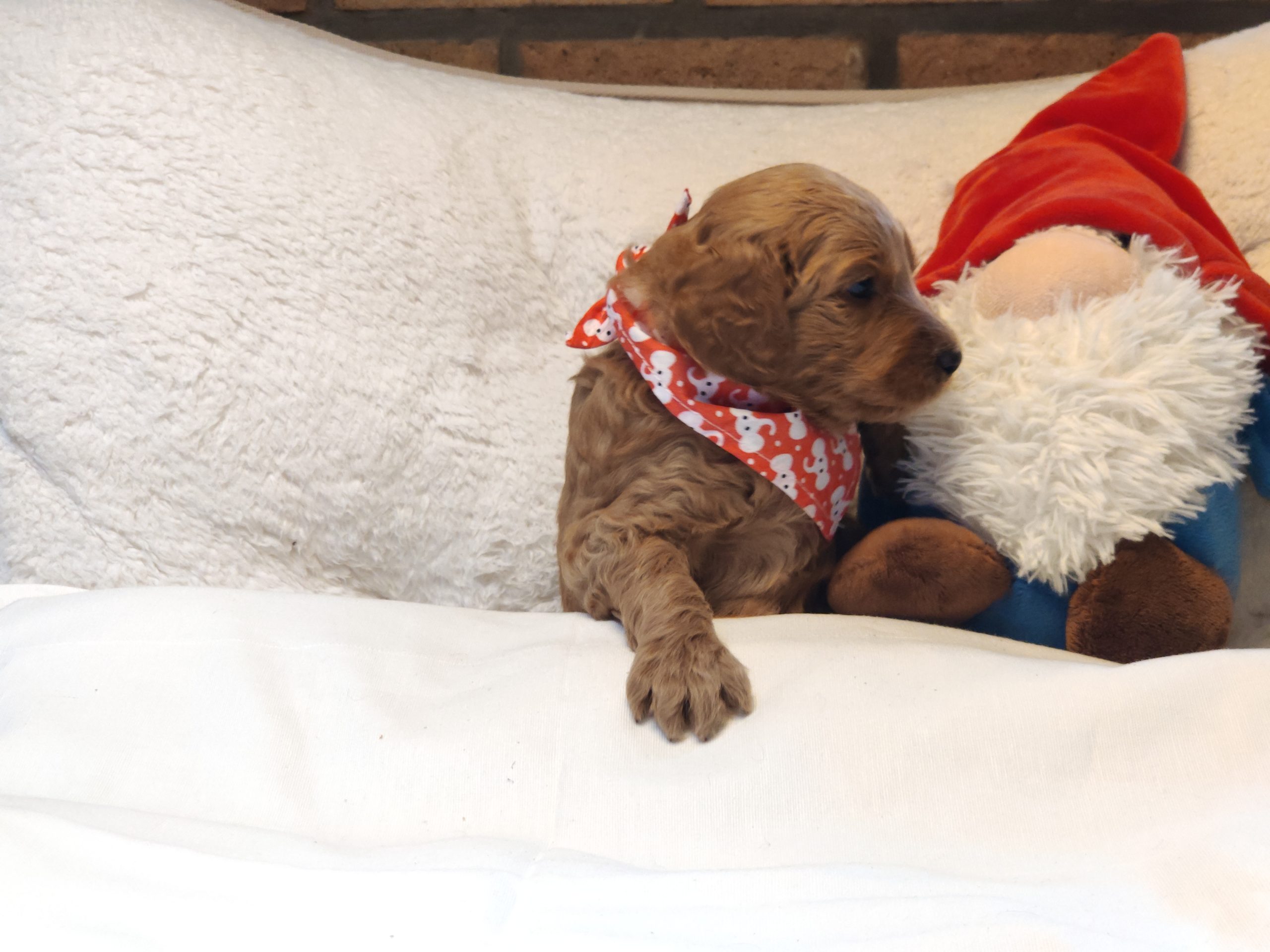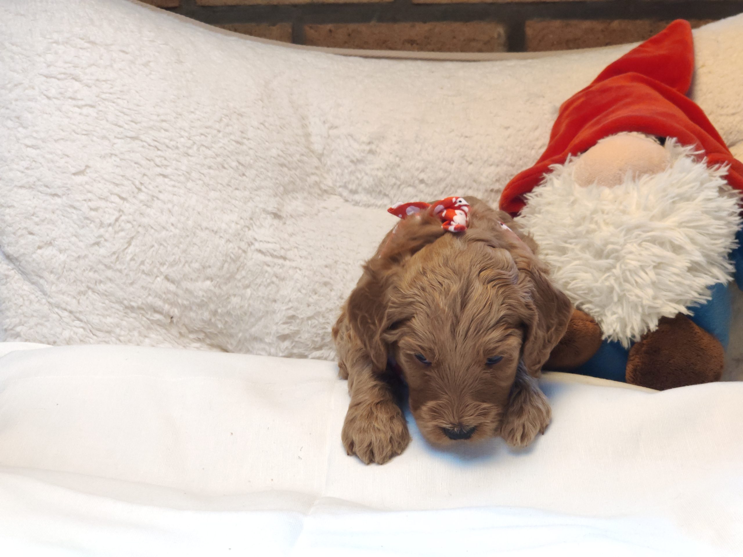 Miss Red stands out with her striking red coat, blending beauty with a serene temperament. She embodies the perfect balance of relaxation and playfulness, making her an endearing presence in any setting. She loooves to cuddle and play with her people. Known for her intelligence, Miss Red is not just a pretty face; she is clever and quick to learn new things. Her love for cuddles and her people highlights her affectionate nature, making her a beloved and brilliant companion who enriches the lives of those around her. She is a gorgeous puppy who is a pure joy to be around.